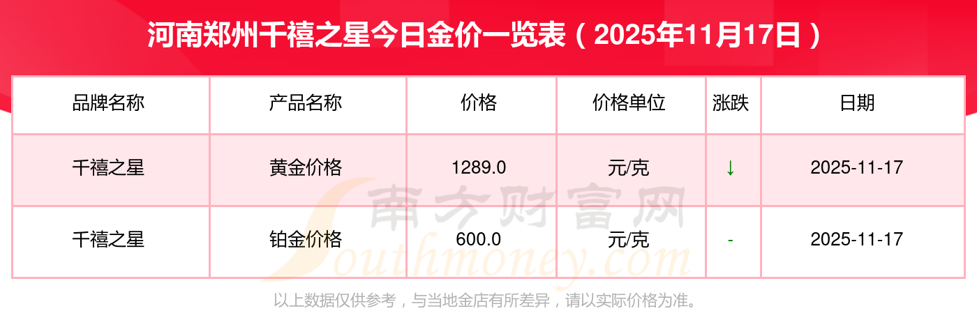 2025年11月17日河南郑州千禧之星每克黄金的市场价格是多少:金饰价格(内地)1305.0元/克,黄金饰品(香港)46270.0,铂金饰品(香港)13490.0,金条金价(香港)41990.0,投资金条1280.0元/克,工艺金条1295.0元/克,千足金首饰1285.0元/克,投资银条11.5元/克,黄金回购921.0元/克,白银回购10.7元/克,千足金饰品1256.0元/克。