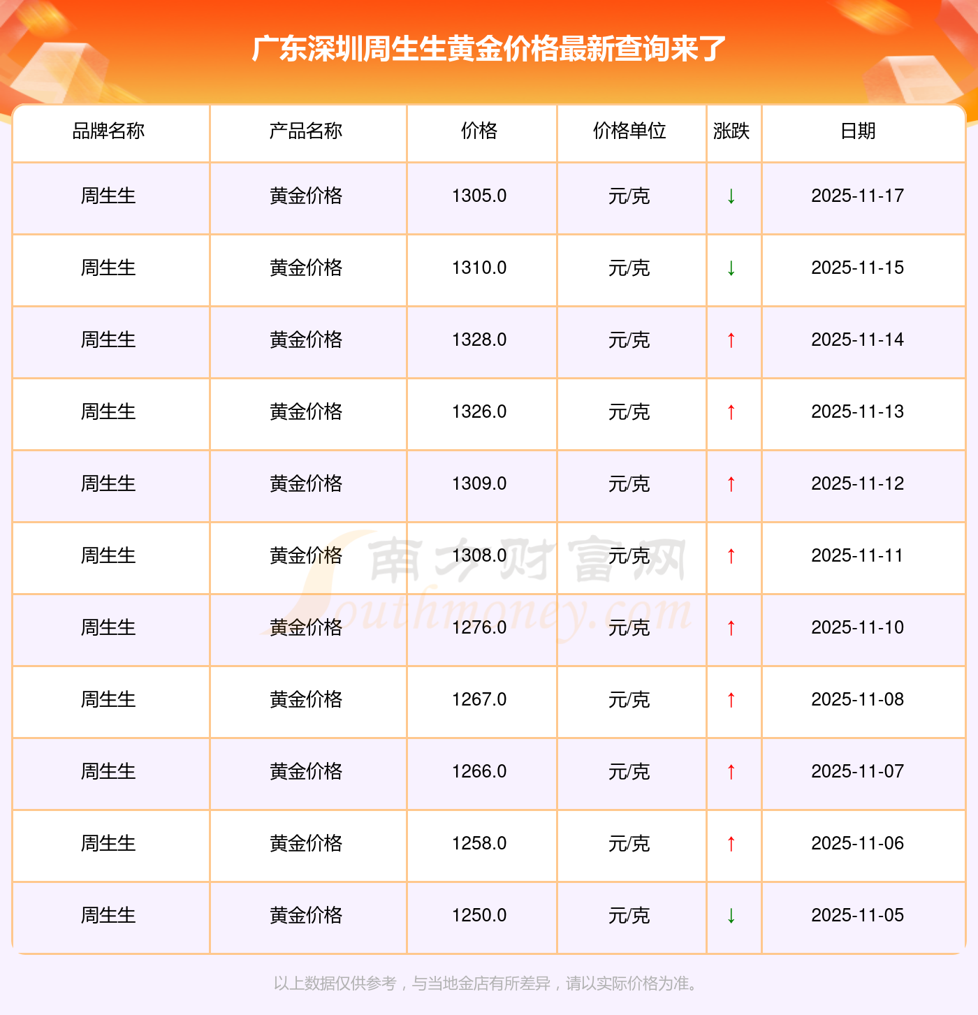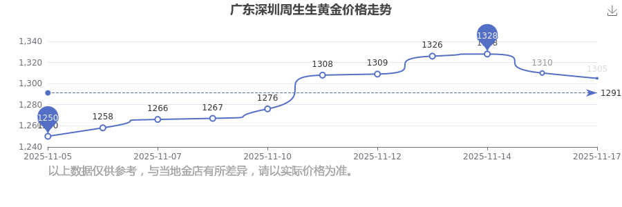 今日广东深圳周生生黄金价格为1305.0元/克。