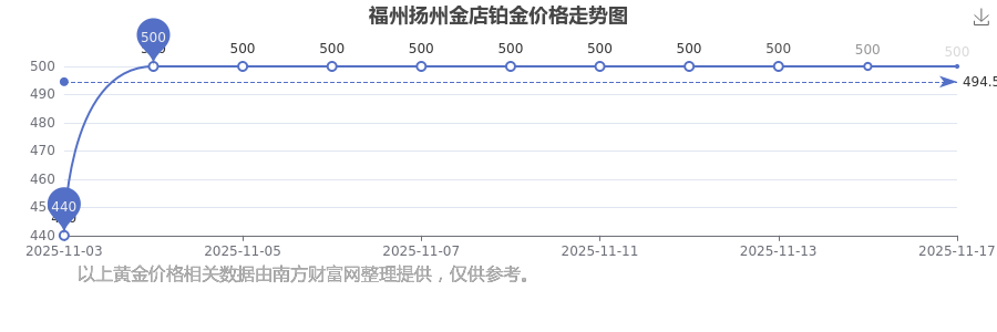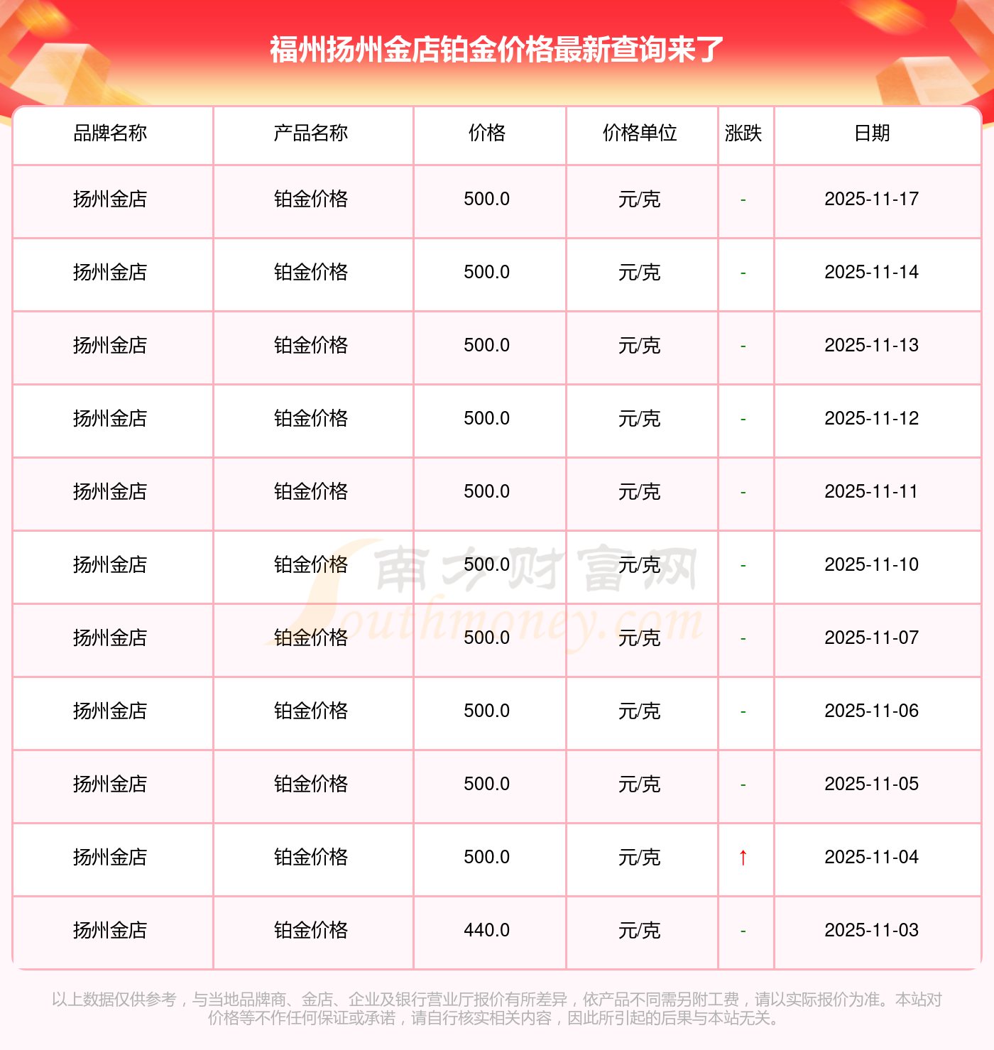 今日(2025年11月17日)福州扬州金店铂金价格为500.0元/克。
