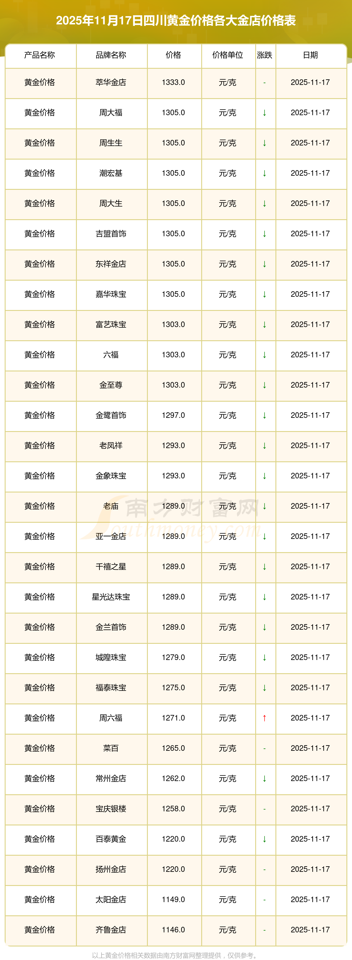 2025年11月17日,四川谢瑞麟、谢瑞麟、谢瑞麟、谢瑞麟、金银街、金银街、金银街、金银街、金银街、金银街、多边金都珠宝等各大金店品牌黄金价格今日价格行情最新来了:谢瑞麟1305.0元/克、谢瑞麟46270.0、谢瑞麟13490.0、谢瑞麟41990.0、金银街1280.0元/克、金银街1295.0元/克、金银街1285.0元/克、金银街11.5元/克、金银街921.0元/克、金银街10.7元/克、多边金都珠宝1256.0元/克。