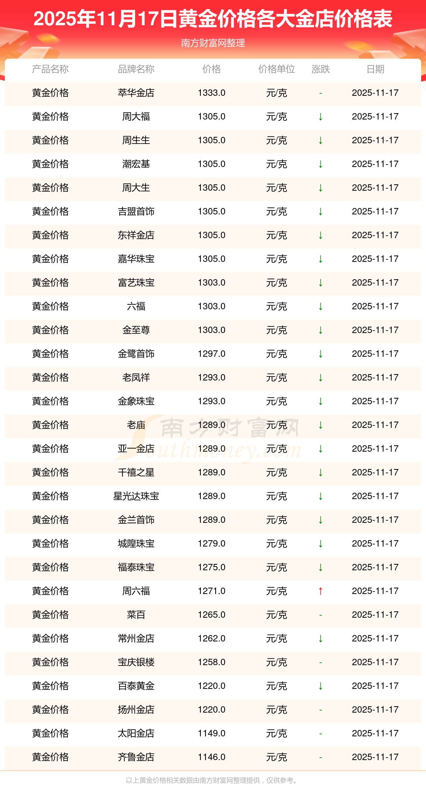 2025年11月17日,谢瑞麟、谢瑞麟、谢瑞麟、谢瑞麟、金银街、金银街、金银街、金银街、金银街、金银街、多边金都珠宝等各大金店品牌黄金价格今日价格如下:谢瑞麟1305.0元/克、谢瑞麟46270.0、谢瑞麟13490.0、谢瑞麟41990.0、金银街1280.0元/克、金银街1295.0元/克、金银街1285.0元/克、金银街11.5元/克、金银街921.0元/克、金银街10.7元/克、多边金都珠宝1256.0元/克。