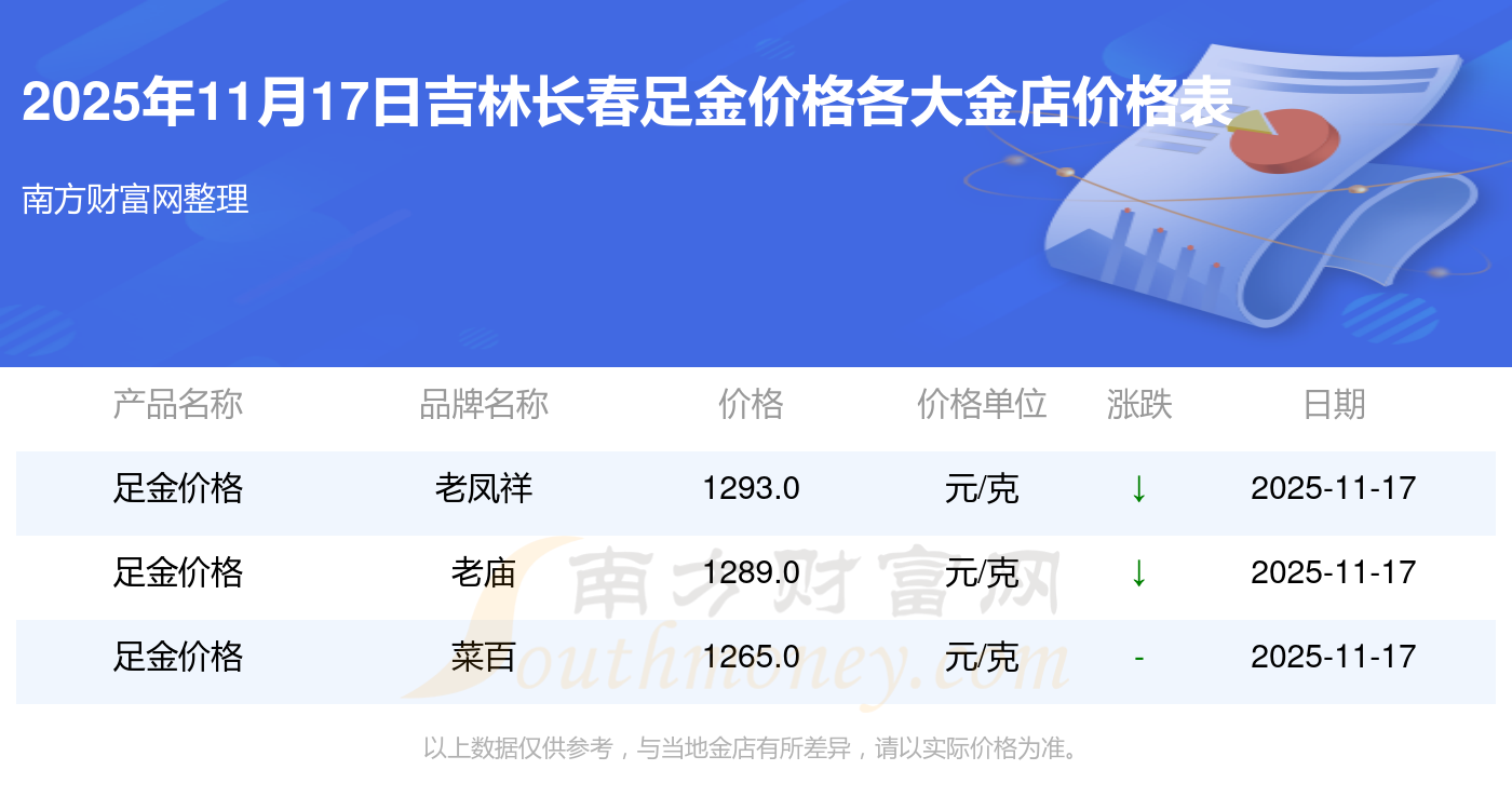 2025年11月17日吉林长春各大金店足金价格最新价格:谢瑞麟1305.0元/克,谢瑞麟46270.0,谢瑞麟13490.0,谢瑞麟41990.0,金银街1280.0元/克,金银街1295.0元/克,金银街1285.0元/克,金银街11.5元/克,金银街921.0元/克,金银街10.7元/克,多边金都珠宝1256.0元/克。