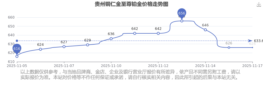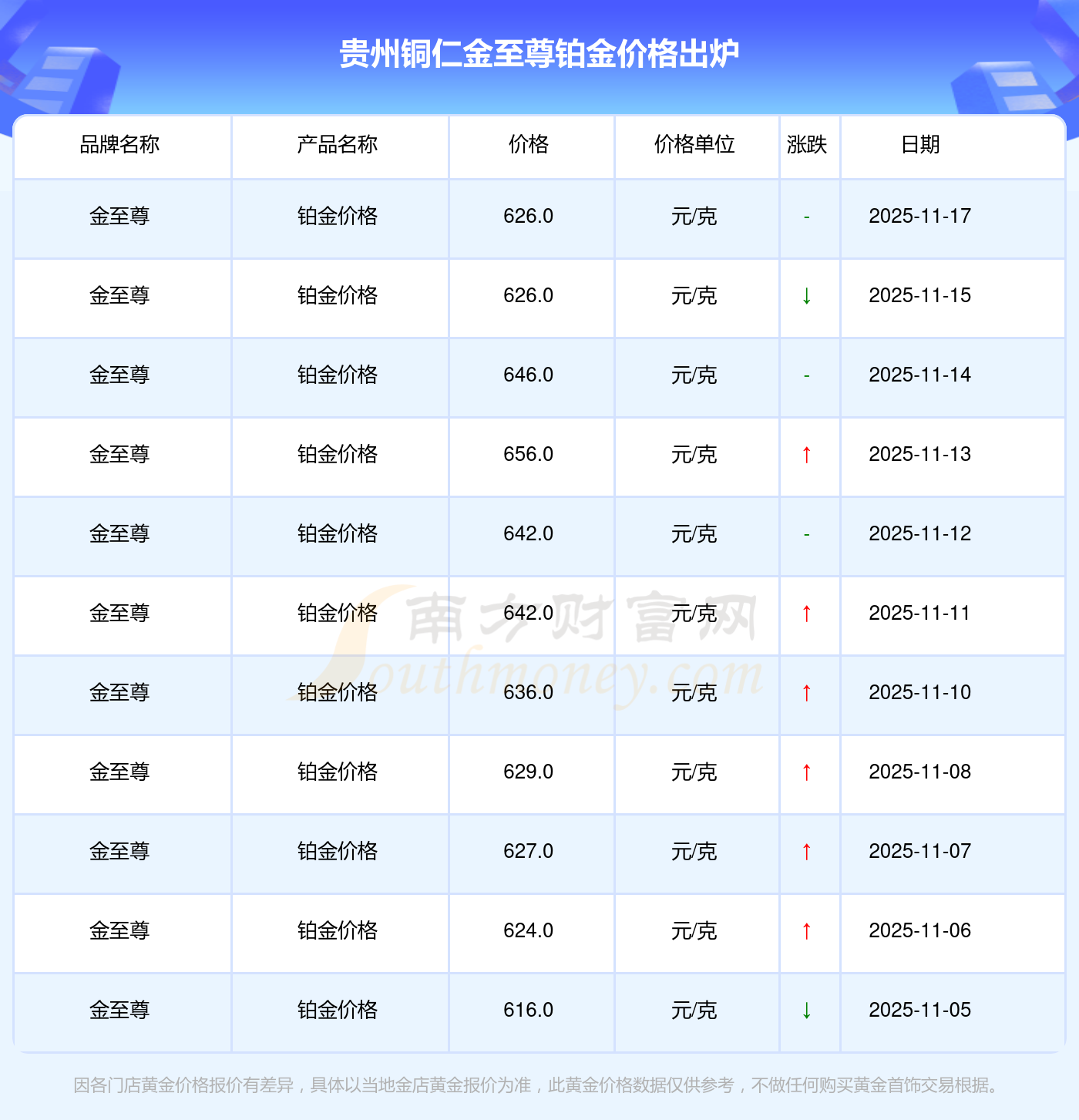 2025年11月17日,贵州铜仁金至尊所售铂金价格,其价格设定为 626.0元/克。