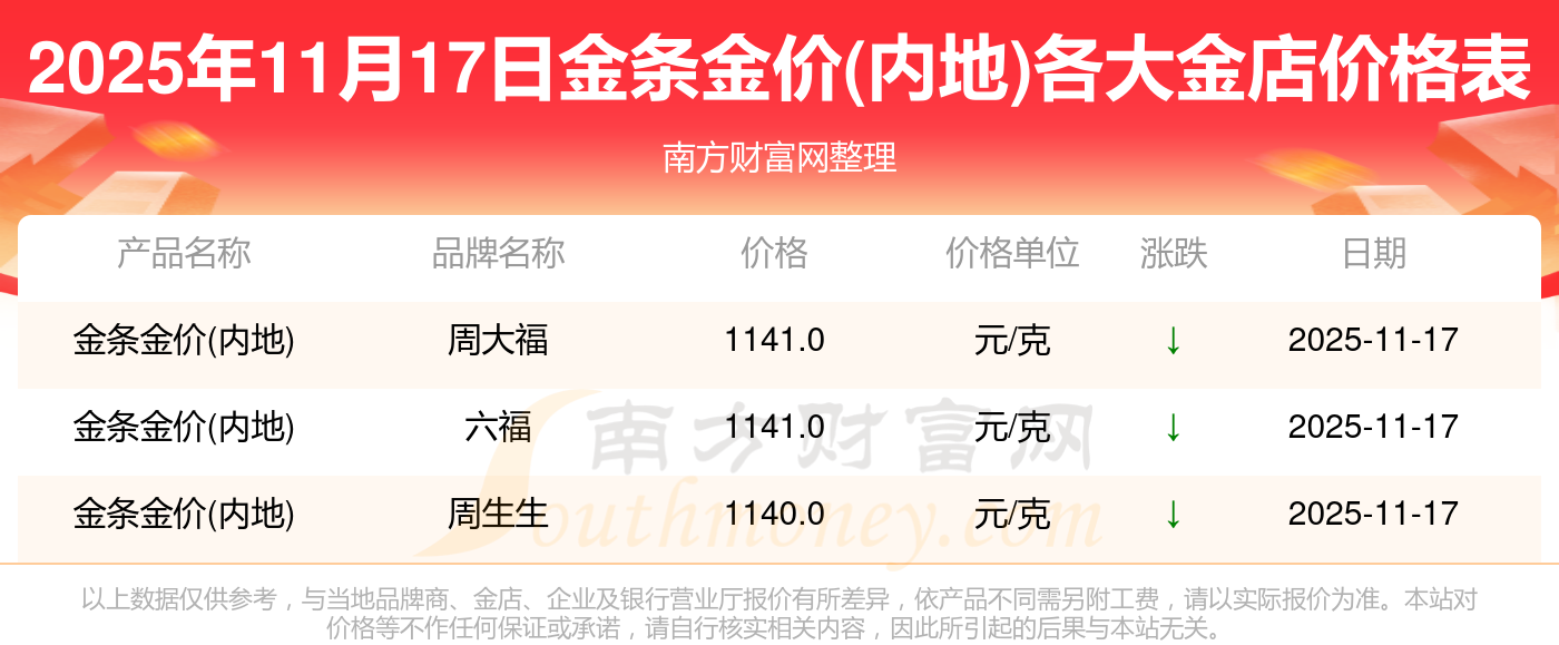 2025年11月17日谢瑞麟、谢瑞麟、谢瑞麟、谢瑞麟、金银街、金银街、金银街、金银街、金银街、金银街、多边金都珠宝等各大金店品牌金条金价(内地)最新价格如下:谢瑞麟金饰价格(内地)1305.0元/克,谢瑞麟黄金饰品(香港)46270.0,谢瑞麟铂金饰品(香港)13490.0,谢瑞麟金条金价(香港)41990.0,金银街投资金条1280.0元/克,金银街工艺金条1295.0元/克,金银街千足金首饰1285.0元/克,金银街投资银条11.5元/克,金银街黄金回购921.0元/克,金银街白银回购10.7元/克,多边金都珠宝千足金饰品1256.0元/克。