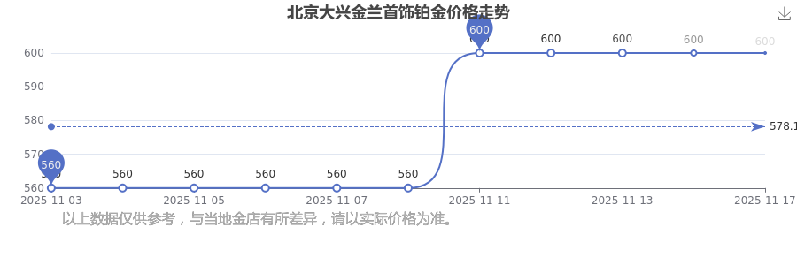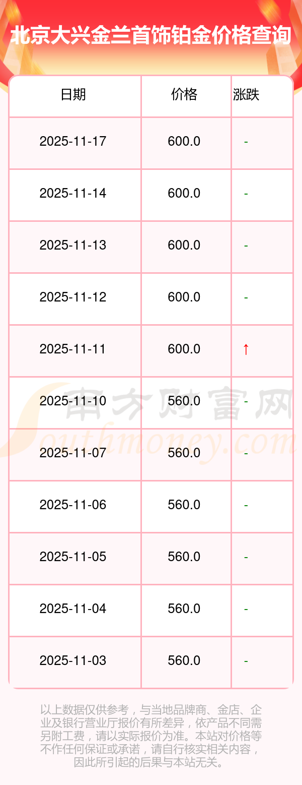 今日(2025年11月17日)北京大兴金兰首饰铂金价格:600.0元/克。