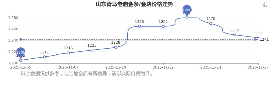 今日山东青岛老庙金条/金块价格的价格为1245.0元/克。