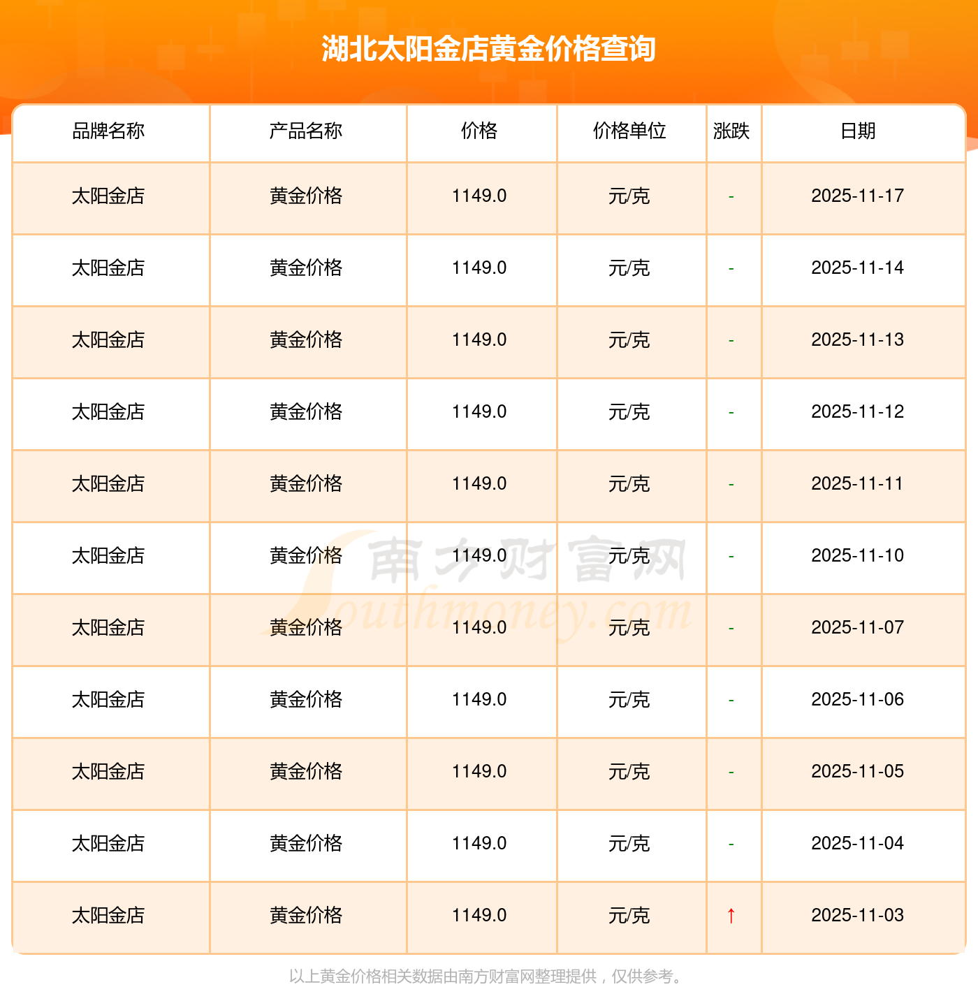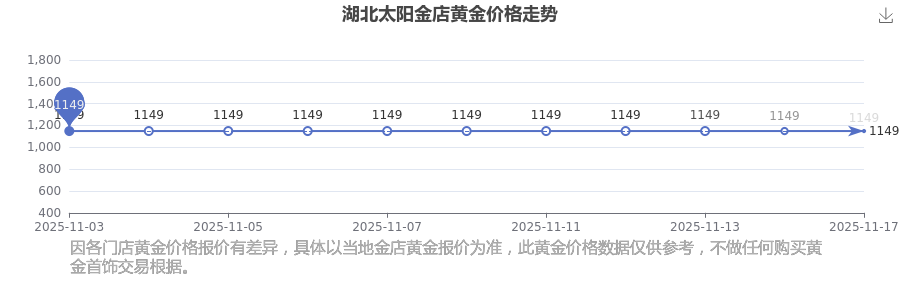 湖北太阳金店 2025年11月17日的黄金价格价位为 1149.0元/克。