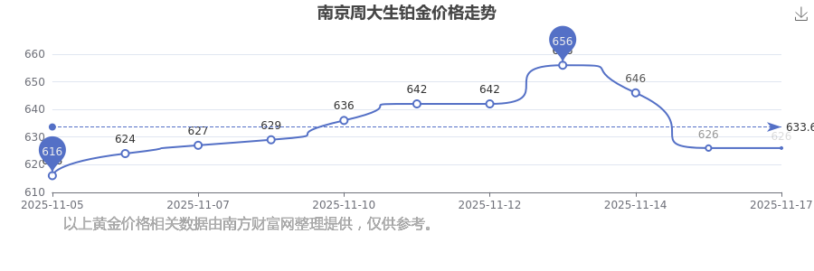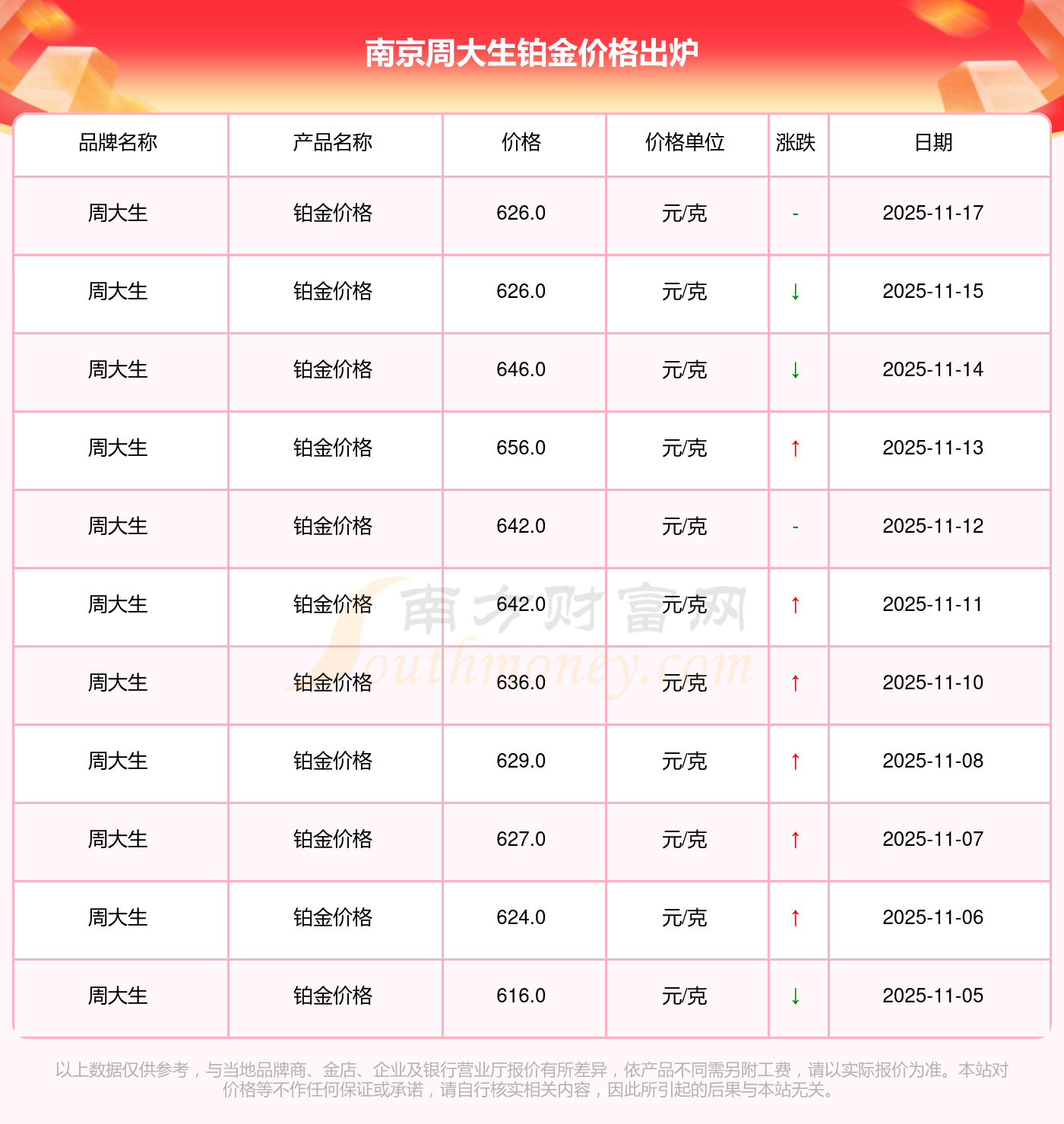 2025年11月17日南京周大生铂金价格为626.0元/克。