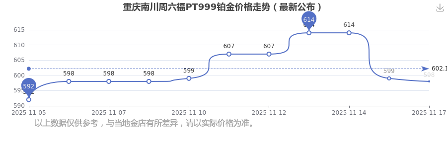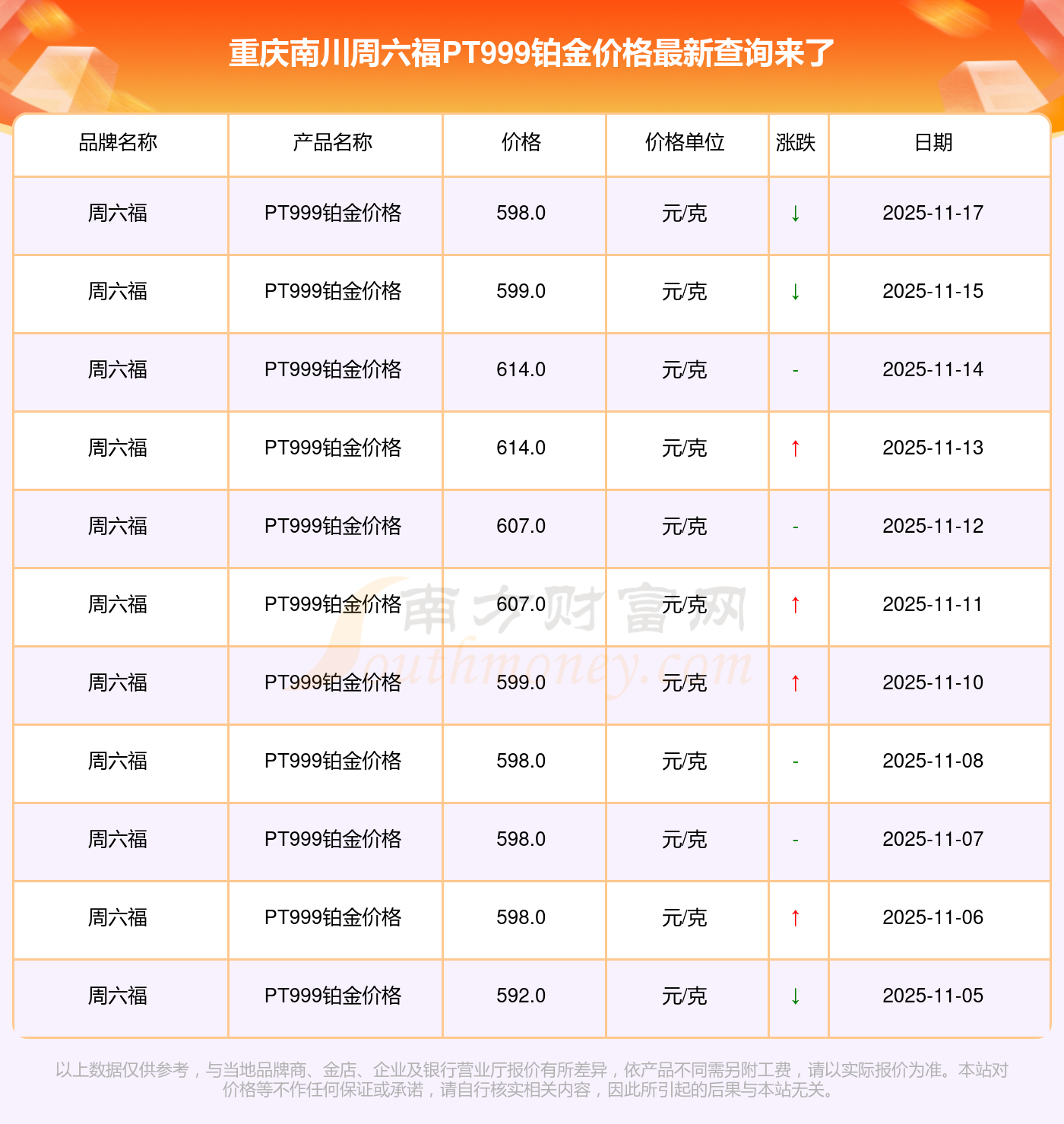 2025年11月17日,今日重庆南川周六福PT999铂金价格:598.0元/克。