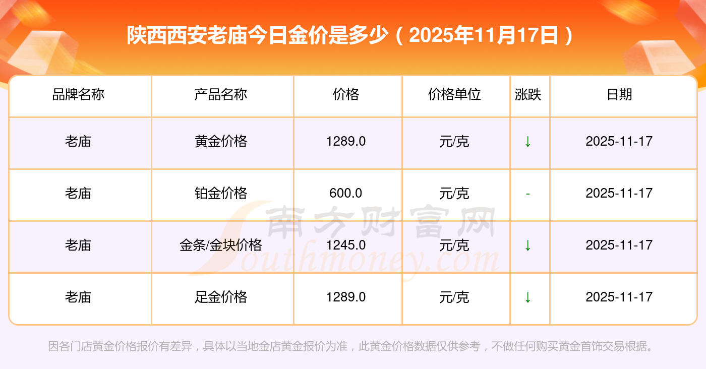 2025年11月17日陕西西安老庙现在黄金一克要多少钱:金饰价格(内地)1305.0元/克,黄金饰品(香港)46270.0,铂金饰品(香港)13490.0,金条金价(香港)41990.0,投资金条1280.0元/克,工艺金条1295.0元/克,千足金首饰1285.0元/克,投资银条11.5元/克,黄金回购921.0元/克,白银回购10.7元/克,千足金饰品1256.0元/克。