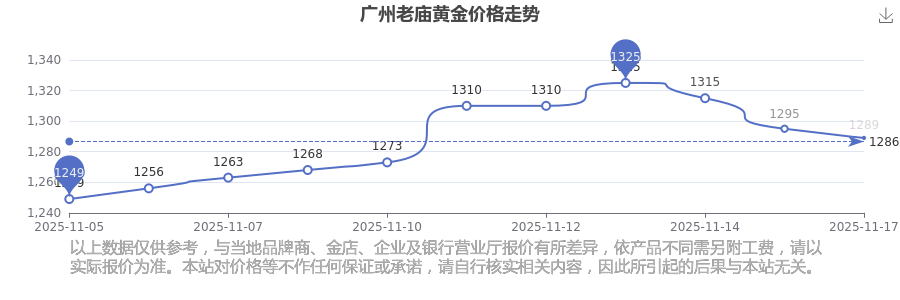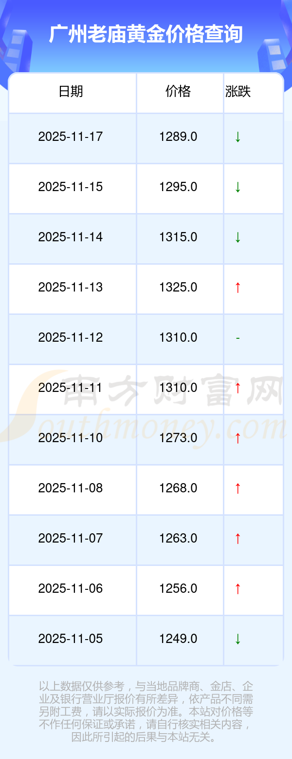 2025年11月17日广州老庙黄金价格为1289.0元/克。