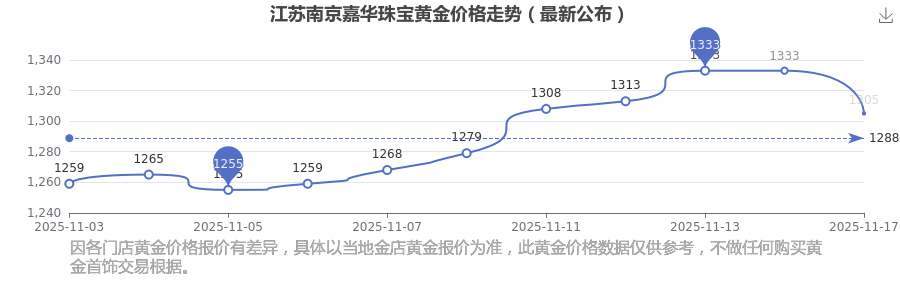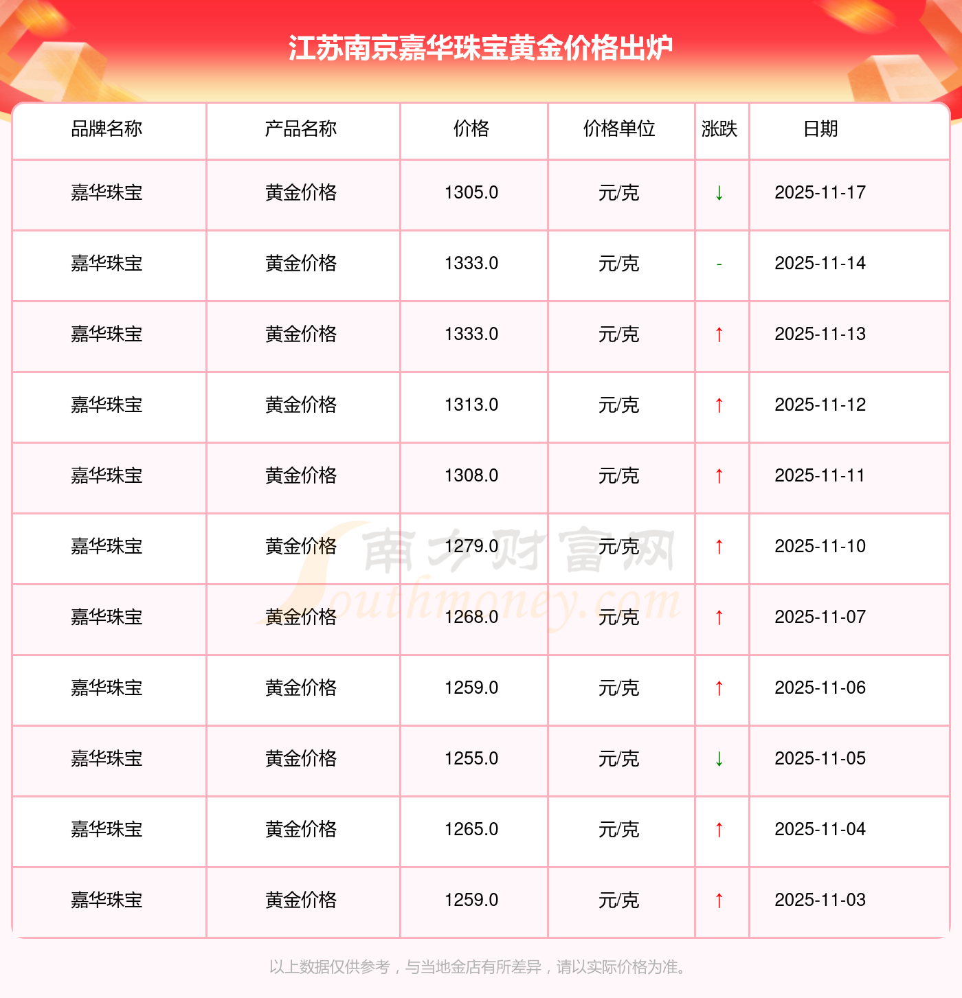1305.0元/克,此乃江苏南京嘉华珠宝于 2025年11月17日黄金价格的挂牌价格。