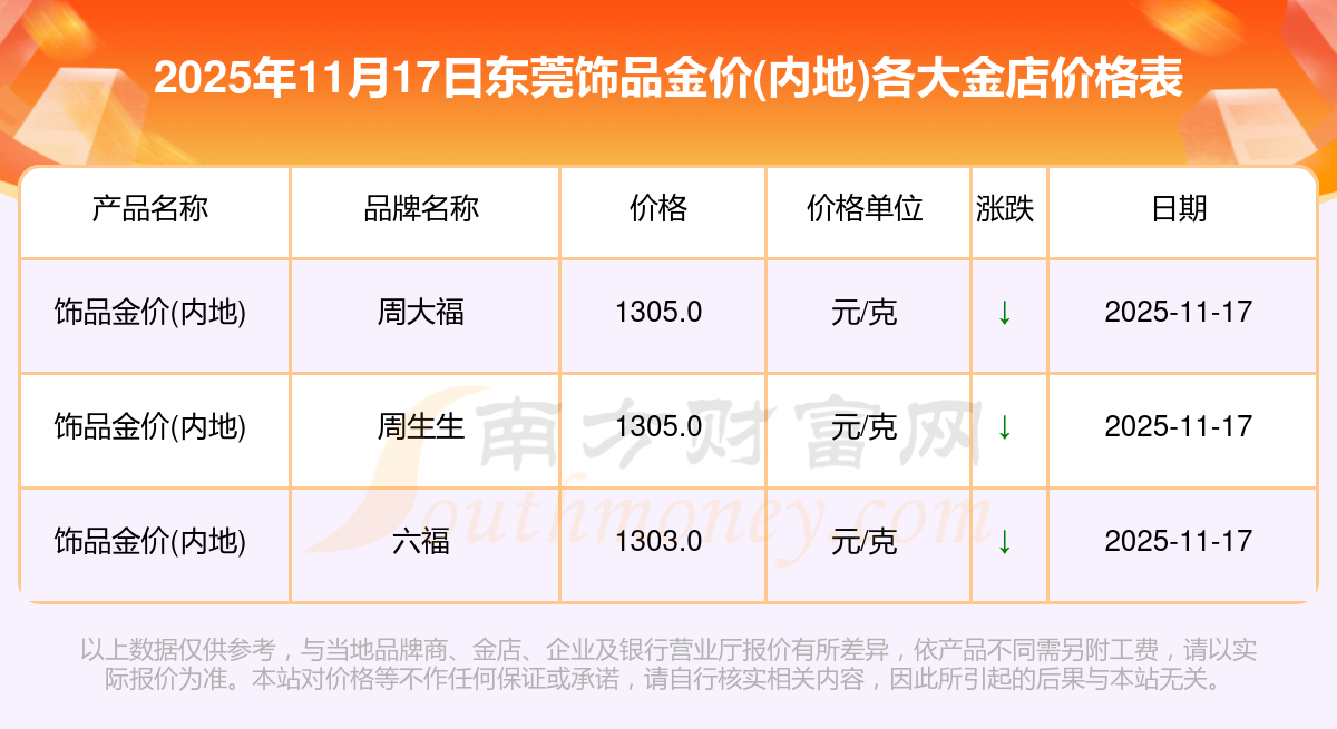 2025年11月17日,东莞谢瑞麟、谢瑞麟、谢瑞麟、谢瑞麟、金银街、金银街、金银街、金银街、金银街、金银街、多边金都珠宝等各大金店品牌饰品金价(内地)今日价格如下:谢瑞麟1305.0元/克、谢瑞麟46270.0、谢瑞麟13490.0、谢瑞麟41990.0、金银街1280.0元/克、金银街1295.0元/克、金银街1285.0元/克、金银街11.5元/克、金银街921.0元/克、金银街10.7元/克、多边金都珠宝1256.0元/克。