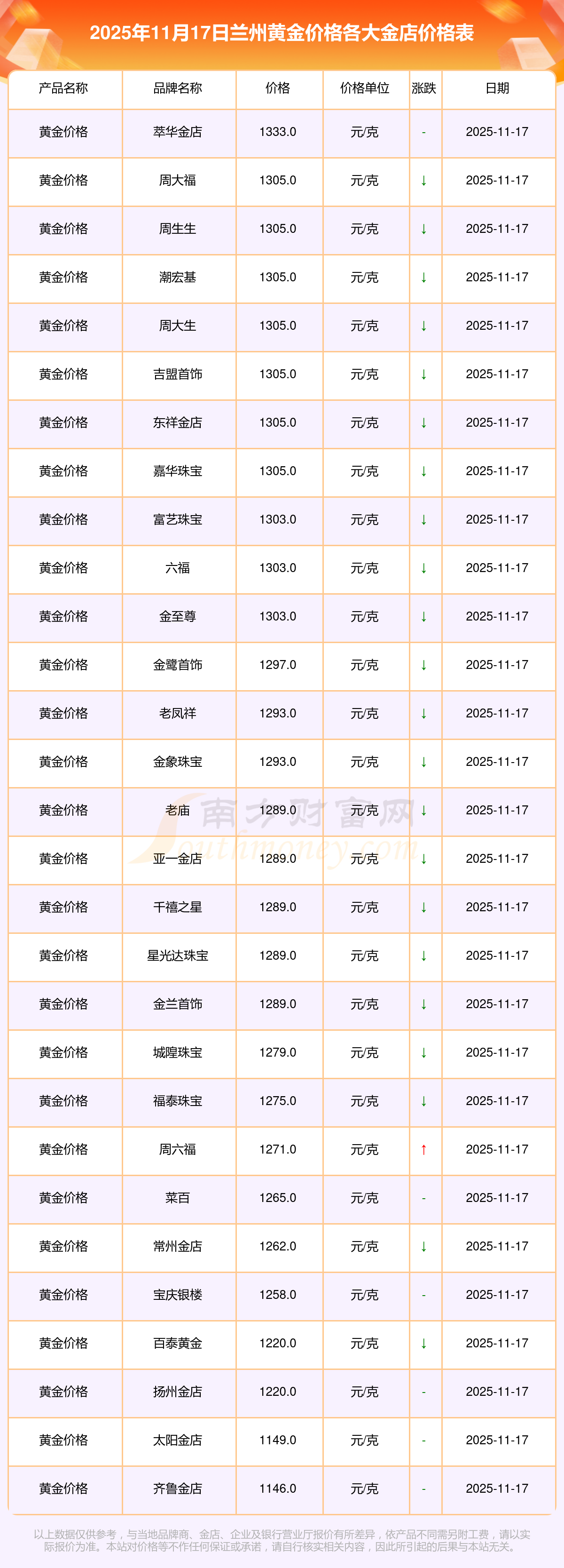 一、各大金店黄金价格查询,2025年11月17日兰州各大金店黄金价格表来了