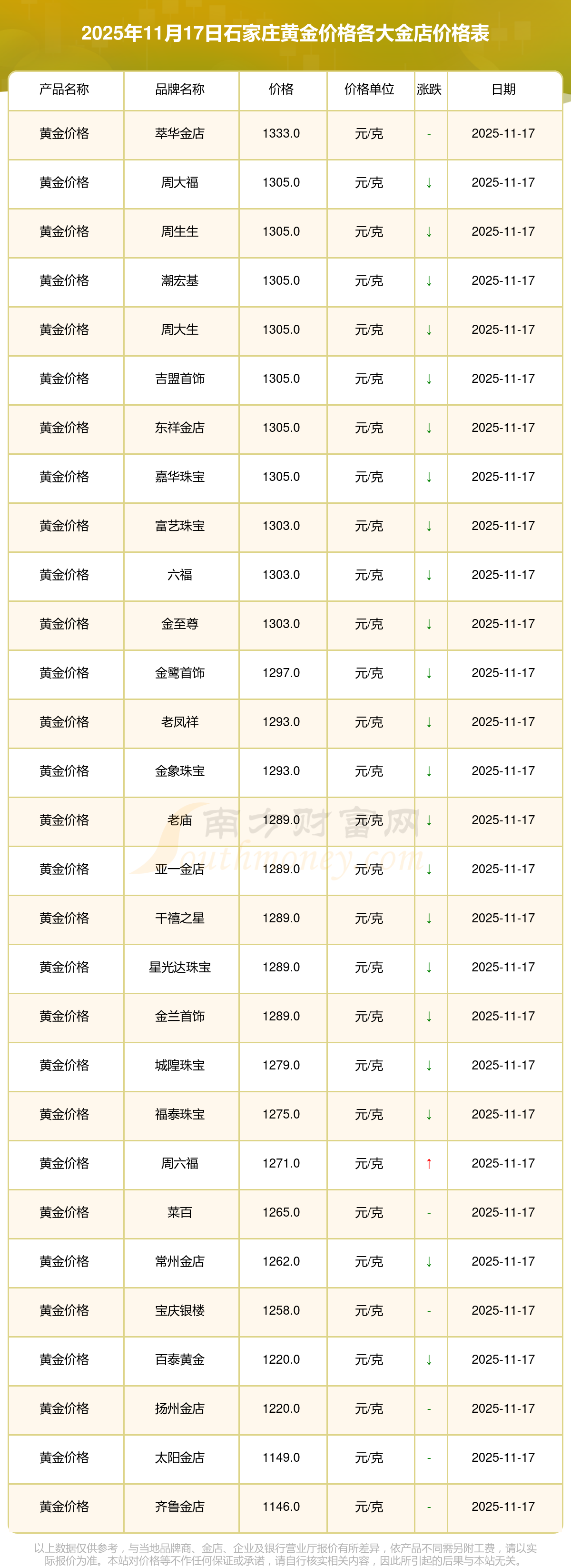 2025年11月17日石家庄各大金店黄金价格最新价格查询来了:谢瑞麟1305.0元/克,谢瑞麟46270.0,谢瑞麟13490.0,谢瑞麟41990.0,金银街1280.0元/克,金银街1295.0元/克,金银街1285.0元/克,金银街11.5元/克,金银街921.0元/克,金银街10.7元/克,多边金都珠宝1256.0元/克。