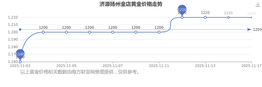 2025年11月17日,济源扬州金店黄金价格每克的售卖价位为1220.0元/克。
