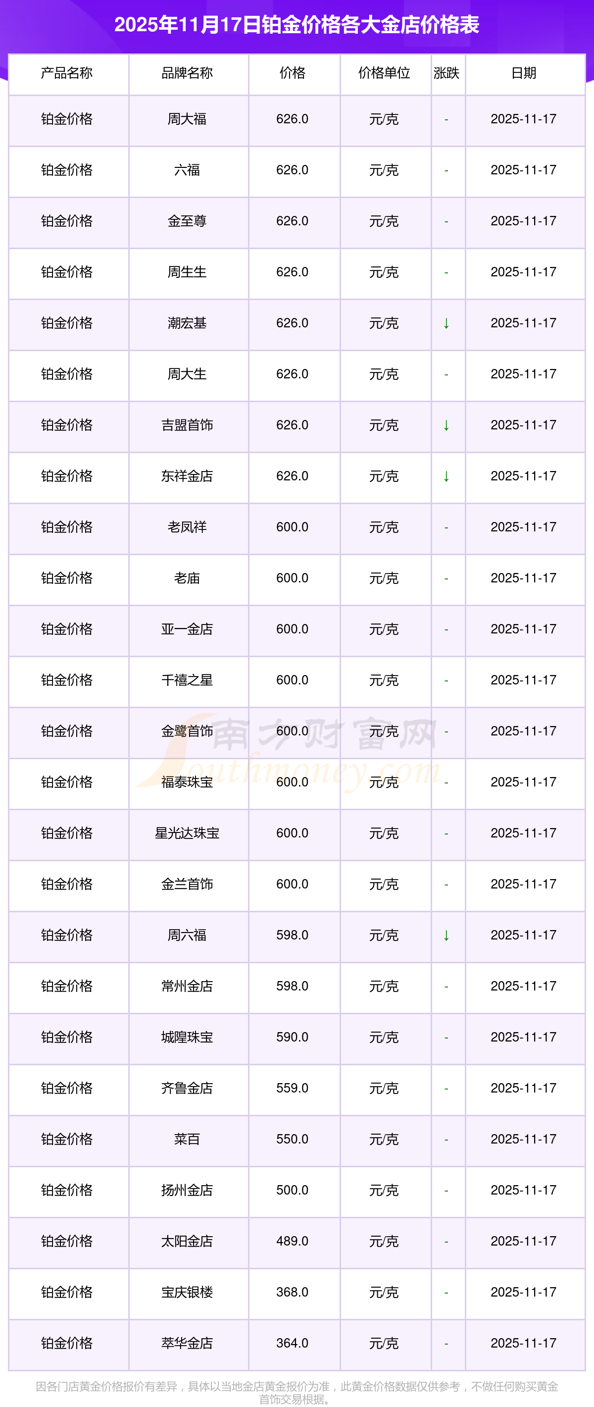 今天是2025年11月17日,谢瑞麟、谢瑞麟、谢瑞麟、谢瑞麟、金银街、金银街、金银街、金银街、金银街、金银街、多边金都珠宝等各大金店品牌铂金价格最新价格如下:谢瑞麟1305.0元/克、谢瑞麟46270.0、谢瑞麟13490.0、谢瑞麟41990.0、金银街1280.0元/克、金银街1295.0元/克、金银街1285.0元/克、金银街11.5元/克、金银街921.0元/克、金银街10.7元/克、多边金都珠宝1256.0元/克。