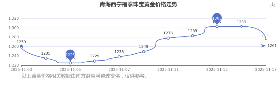 于 2025年11月17日,青海西宁福泰珠宝黄金价格的克价为1275.0元/克。
