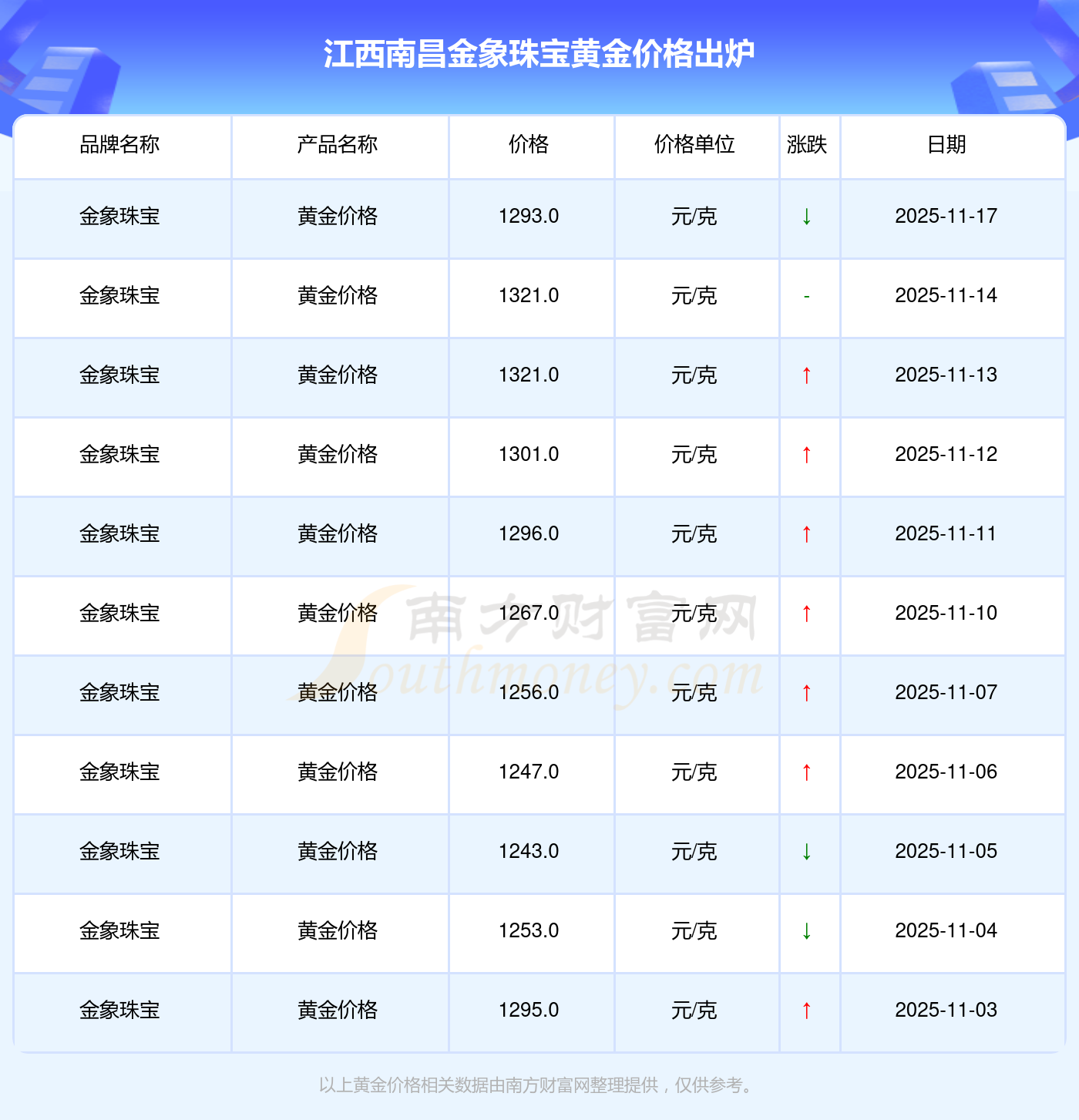 于 2025年11月17日,江西南昌金象珠宝黄金价格的克价为1293.0元/克。