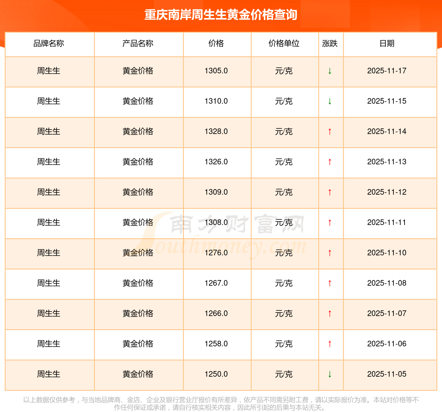 2025年11月17日各大金店黄金价格最新价格:谢瑞麟1305.0元/克,谢瑞麟46270.0,谢瑞麟13490.0,谢瑞麟41990.0,金银街1280.0元/克,金银街1295.0元/克,金银街1285.0元/克,金银街11.5元/克,金银街921.0元/克,金银街10.7元/克,多边金都珠宝1256.0元/克。