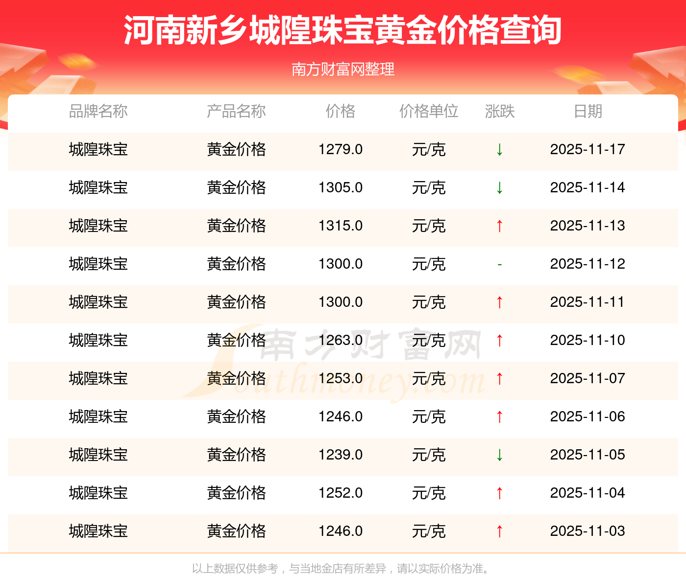 1279.0元/克的黄金价格,是河南新乡城隍珠宝在 2025年11月17日给出的。