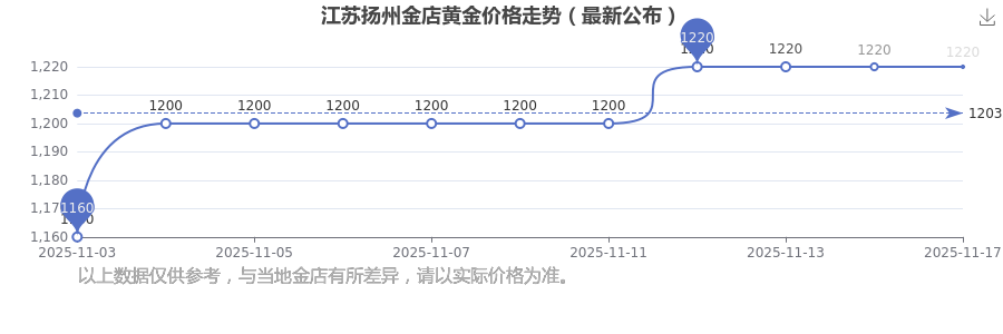 今日江苏扬州金店黄金价格查询,今日(2025年11月17日),1220.0元/克是江苏扬州金店黄金价格的价格标准。