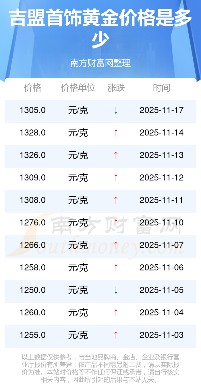 今日(2025年11月18日),吉盟首饰黄金价格最新价格是1305.0元/克。