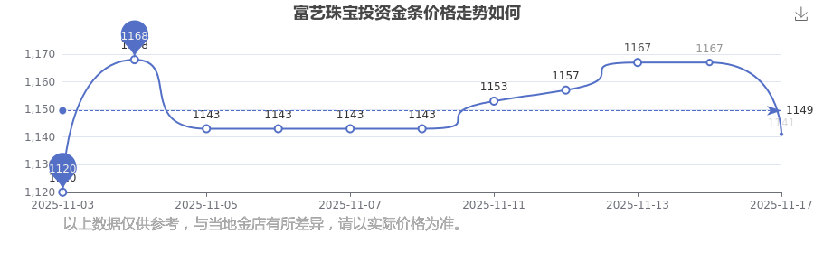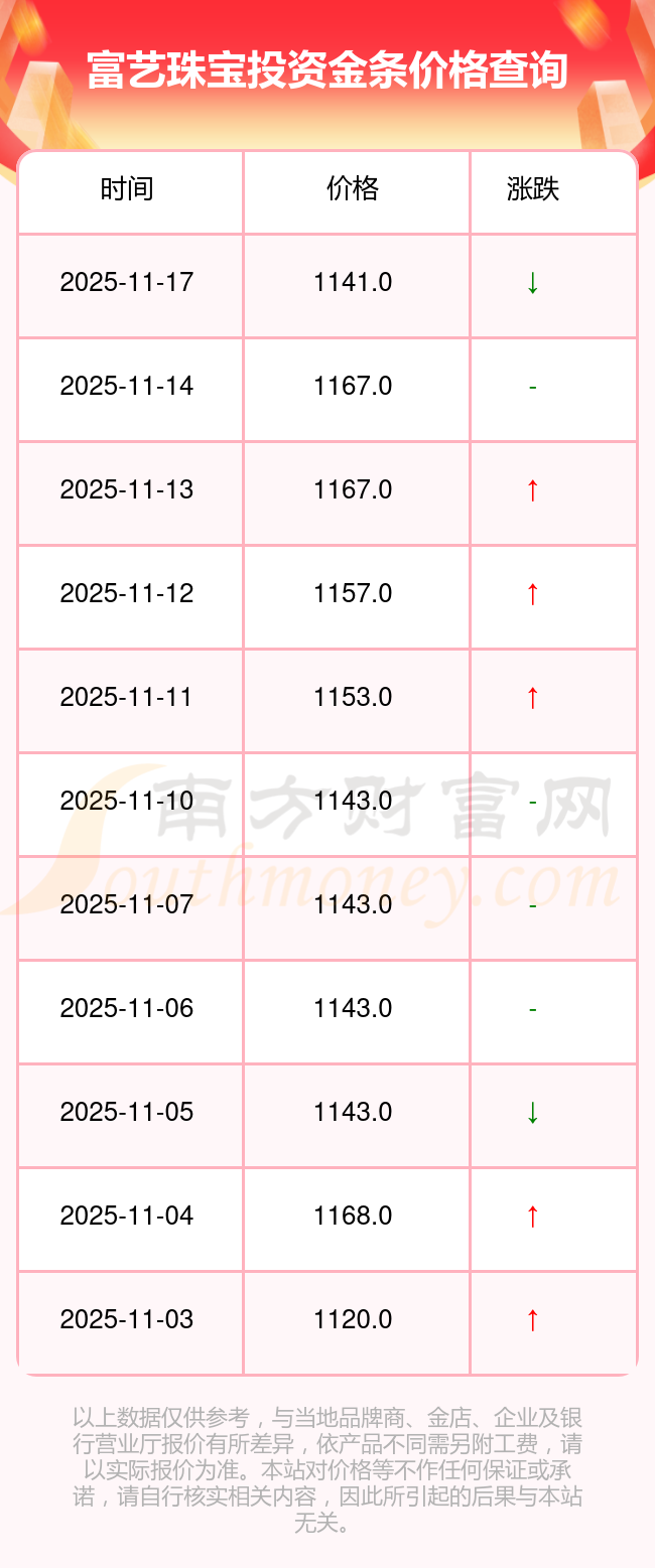 富艺珠宝今日投资金条的最新标价为1141.0元/克。