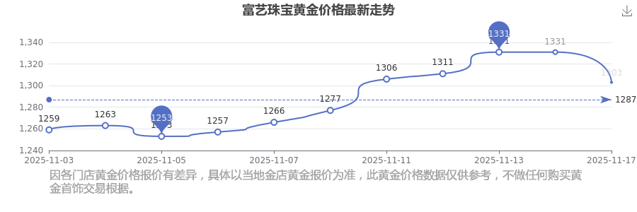富艺珠宝今日黄金价格的最新市场行情价为1303.0元/克。