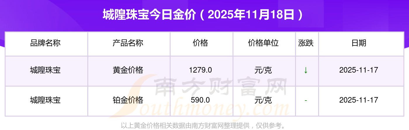 2025年11月18日城隍珠宝今日价格:金饰价格(内地)1305.0元/克,黄金饰品(香港)46270.0,铂金饰品(香港)13490.0,金条金价(香港)41990.0,投资金条1280.0元/克,工艺金条1295.0元/克,千足金首饰1285.0元/克,投资银条11.5元/克,黄金回购921.0元/克,白银回购10.7元/克,千足金饰品1256.0元/克。