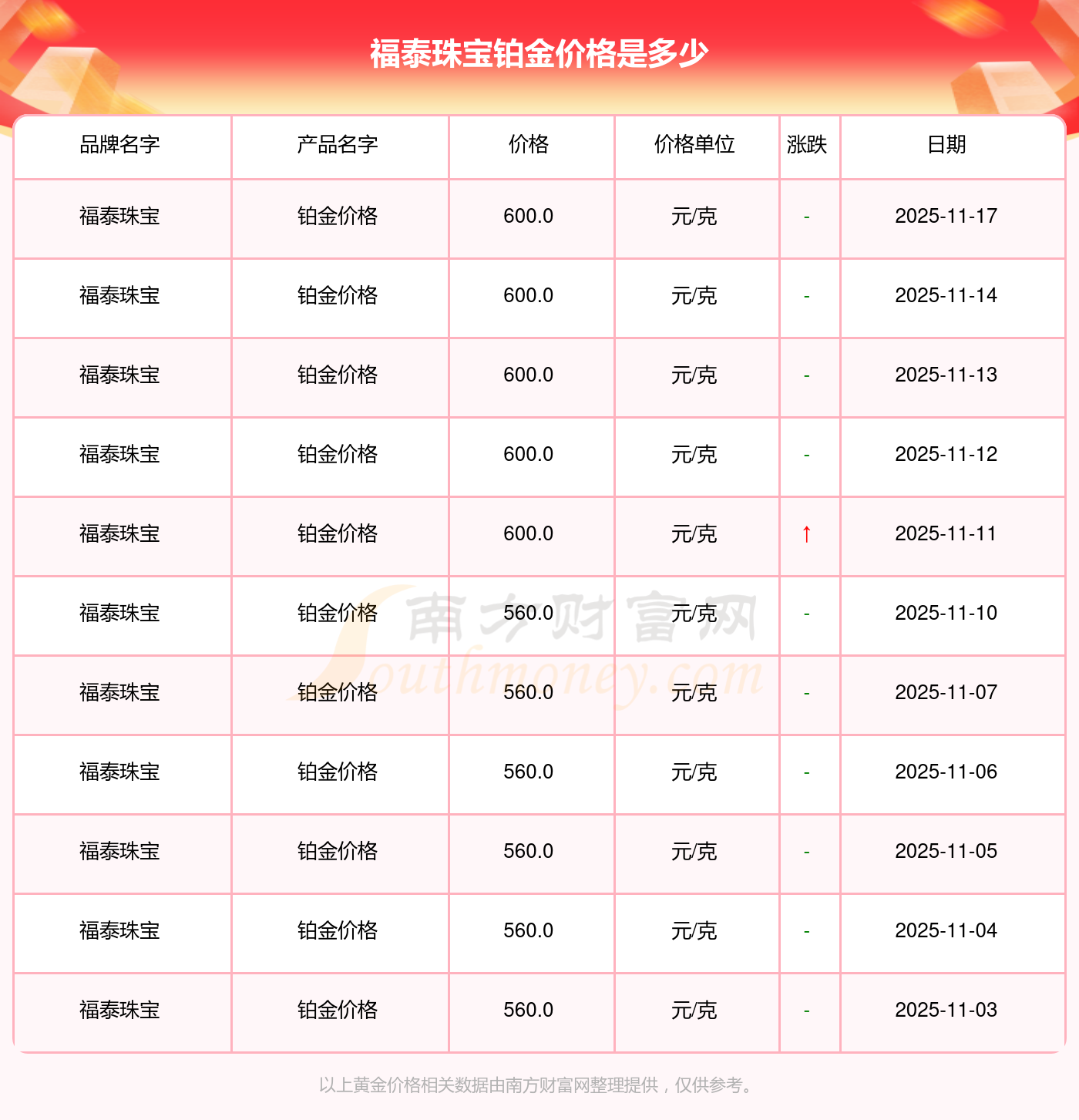 600.0元/克是福泰珠宝在今日给出的 铂金价格最新价格。