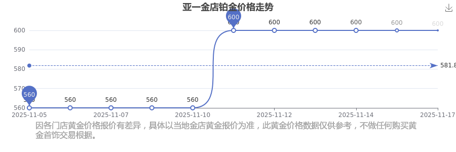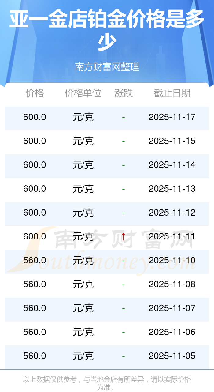 2025年11月18日亚一金店铂金价格:600.0元/克。