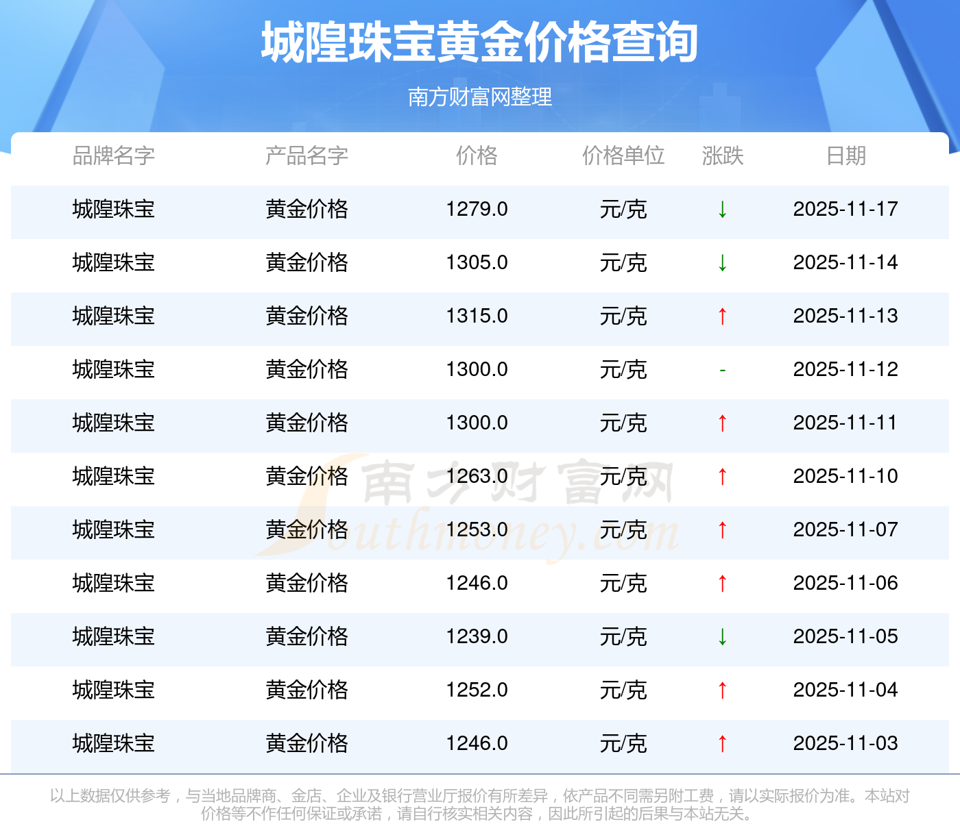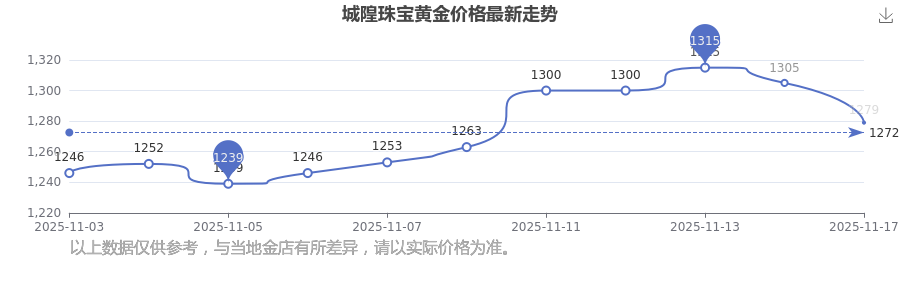 城隍珠宝 黄金价格今日最新的价位是1279.0元/克。