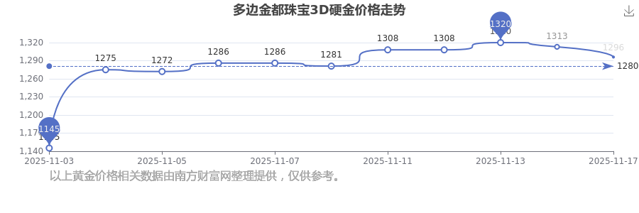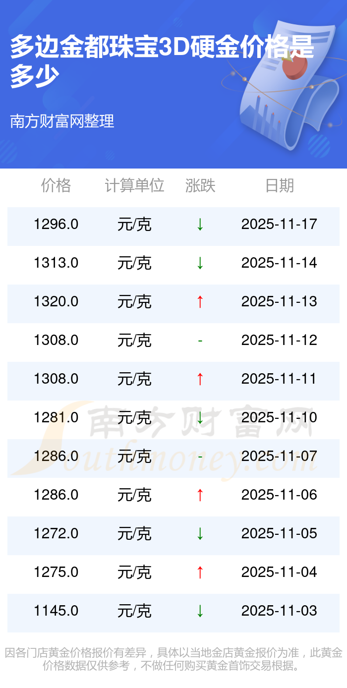 多边金都珠宝今日3D硬金的最新市场行情价为1296.0元/克。