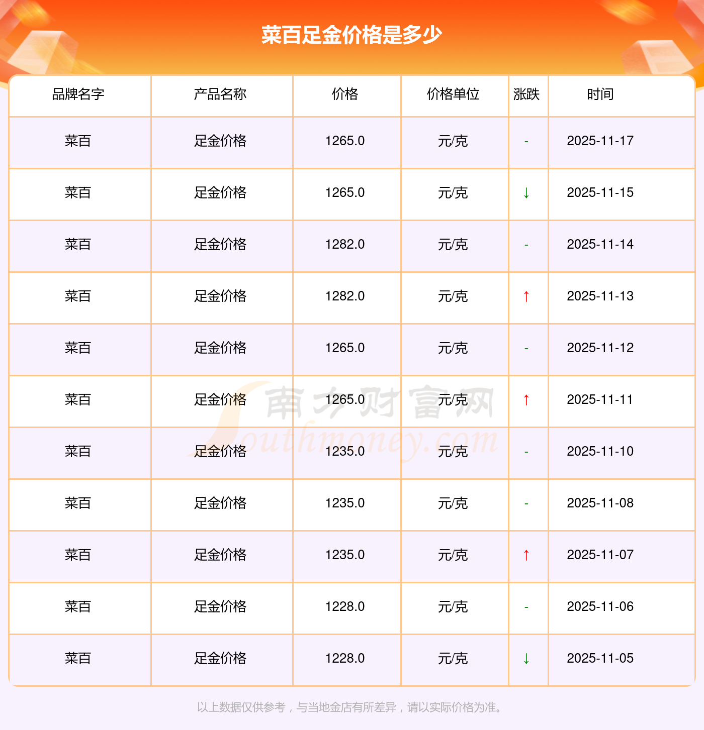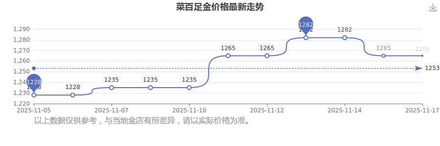 今日(2025年11月18日),菜百足金价格:1265.0元/克。