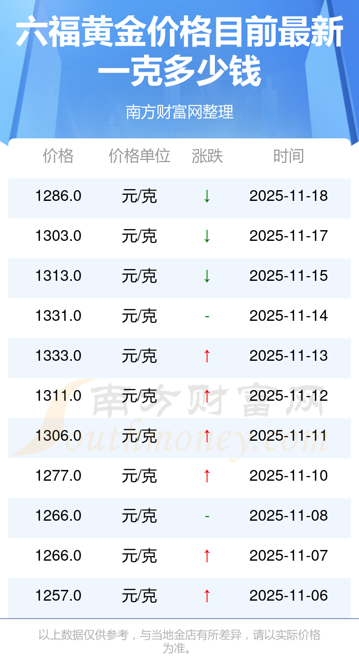 今日(2025年11月18日)六福黄金价格为1286.0元/克。