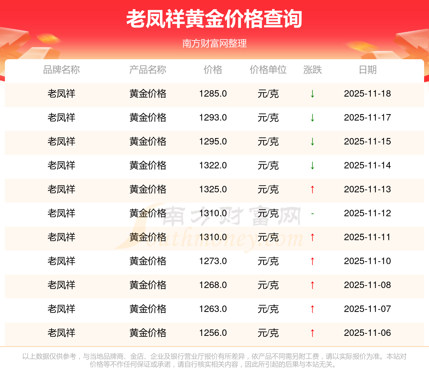 以上数据仅供参考,与当地品牌商、金店、企业及银行营业厅报价有所差异,依产品不同需另附工费,请以实际报价为准。本站对价格等不作任何保证或承诺,请自行核实相关内容,因此所引起的后果与本站无关。