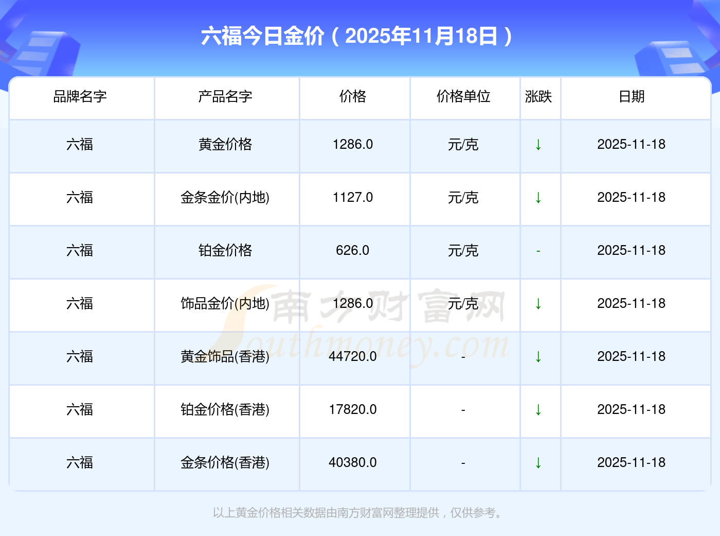 2025年11月18日六福金价查询:黄金价格1288.0元/克,铂金价格626.0元/克,饰品金价(内地)1288.0元/克,黄金饰品(香港)44770.0,铂金价格(香港)17820.0,金条价格(香港)40390.0,金条金价(内地)1127.0元/克,黄金价格1285.0元/克,铂金价格600.0元/克,足金价格1285.0元/克,黄金价格1257.0元/克。