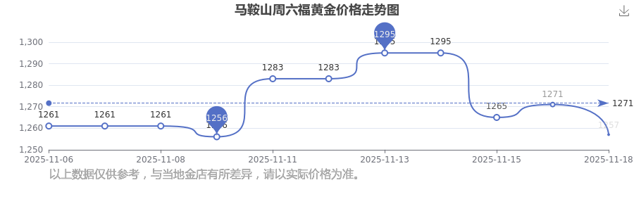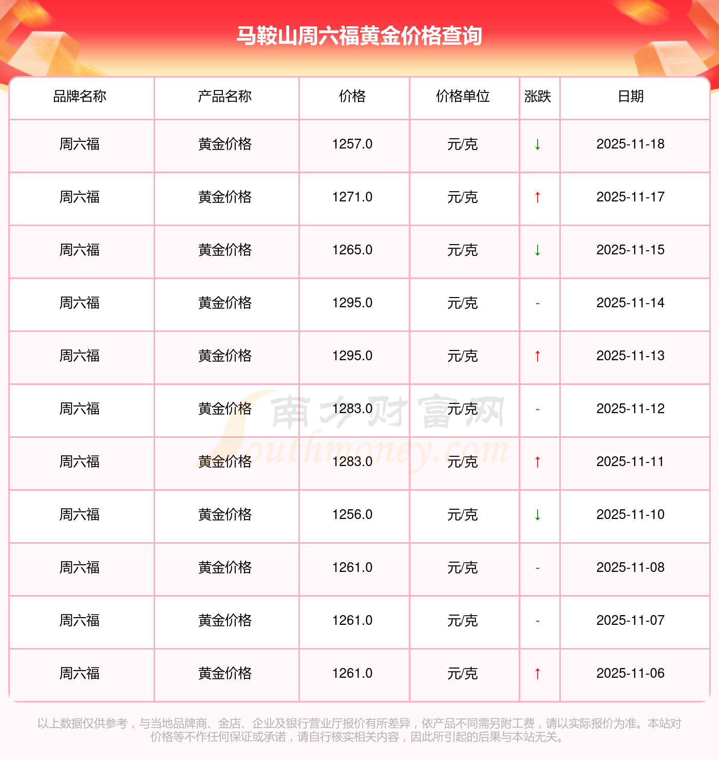 今日(2025年11月18日),马鞍山周六福黄金价格:1257.0元/克。