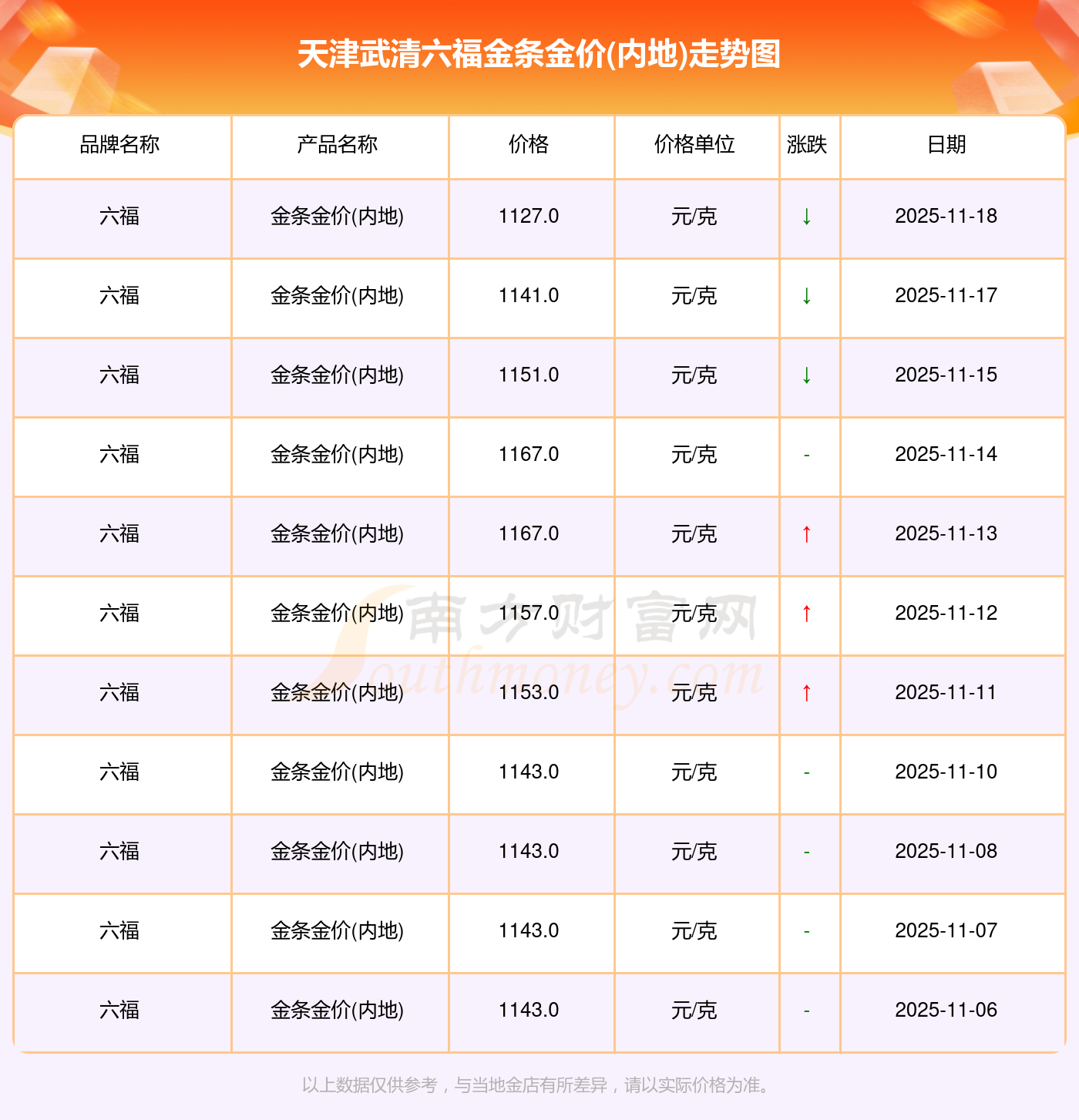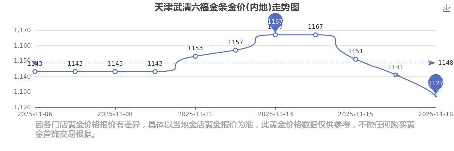 今日天津武清六福金条金价(内地)的价格为1127.0元/克。