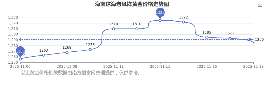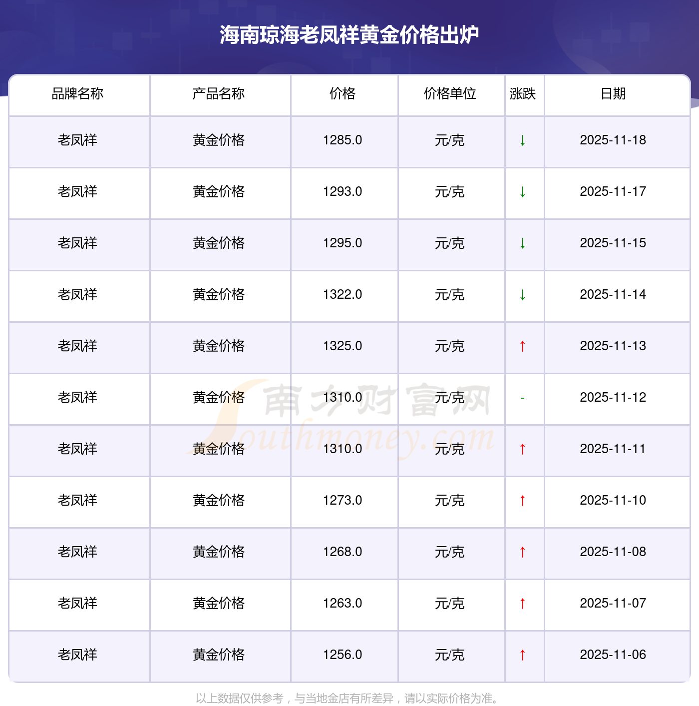 海南琼海老凤祥黄金价格在 2025年11月18日为 1285.0元/克。