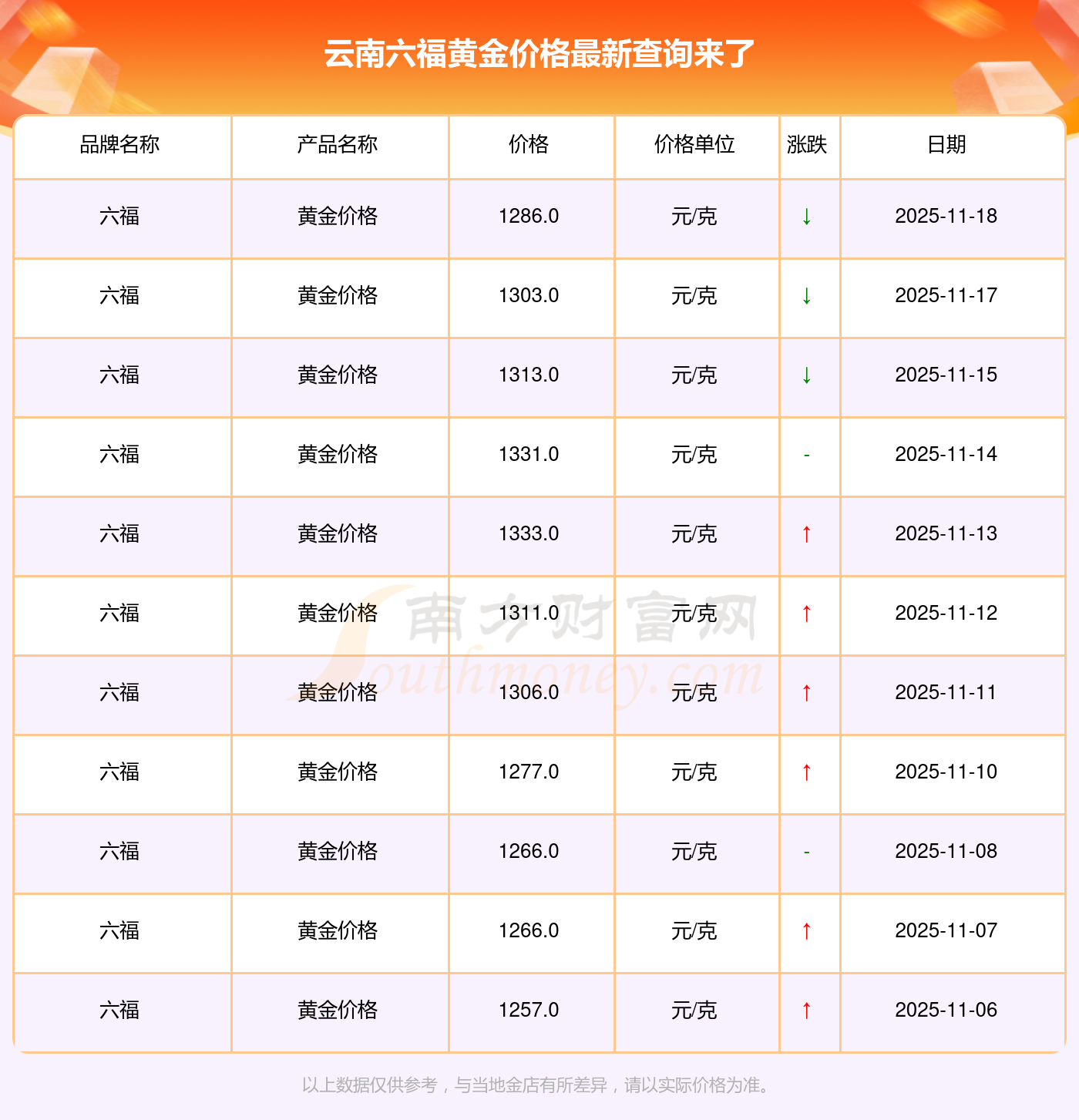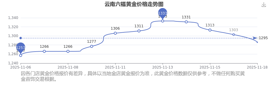 今日2025年11月18日,云南六福黄金价格为1286.0元/克。