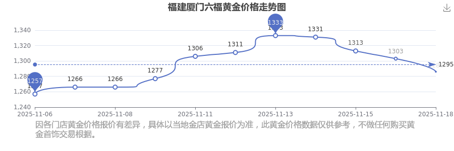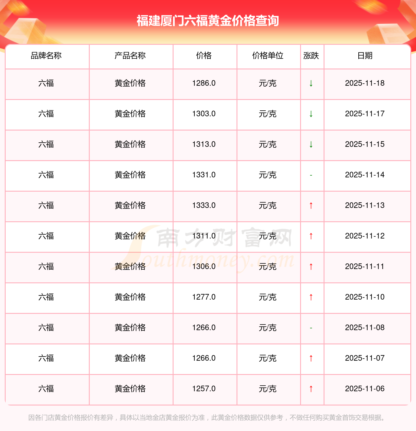 今日(2025年11月18日),福建厦门六福黄金价格的价格是1286.0元/克。