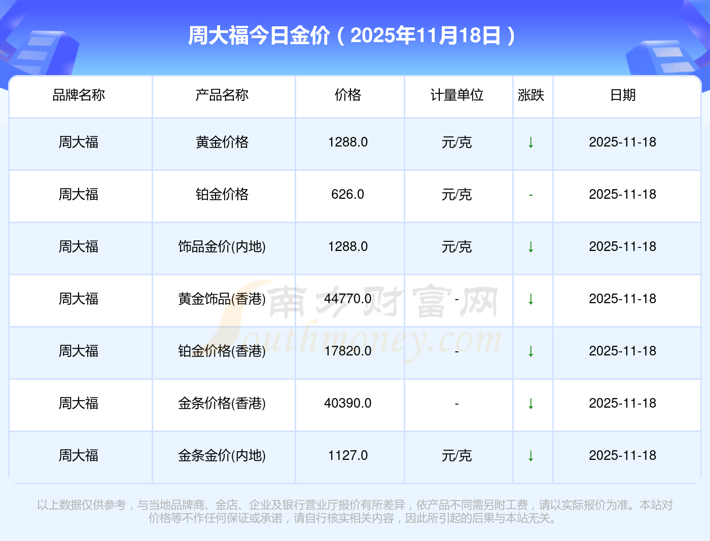 黄金价格1288.0元/克,铂金价格626.0元/克,饰品金价(内地)1288.0元/克,黄金饰品(香港)44770.0,铂金价格(香港)17820.0,金条价格(香港)40390.0,金条金价(内地)1127.0元/克,黄金价格1285.0元/克,铂金价格600.0元/克,足金价格1285.0元/克,黄金价格1257.0元/克。