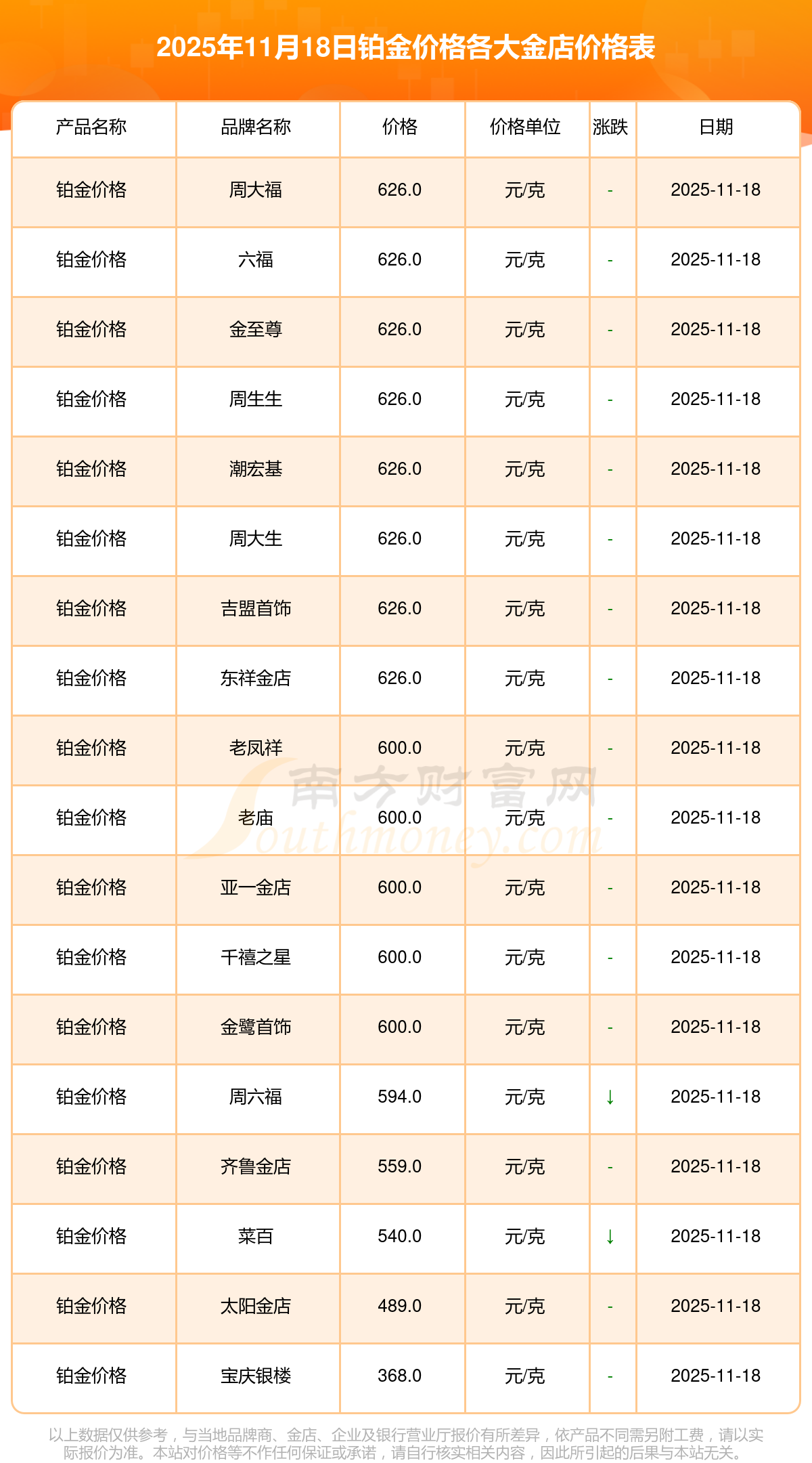 2025年11月18日各大金店铂金价格最新价格 各大金店铂金价格行情一览