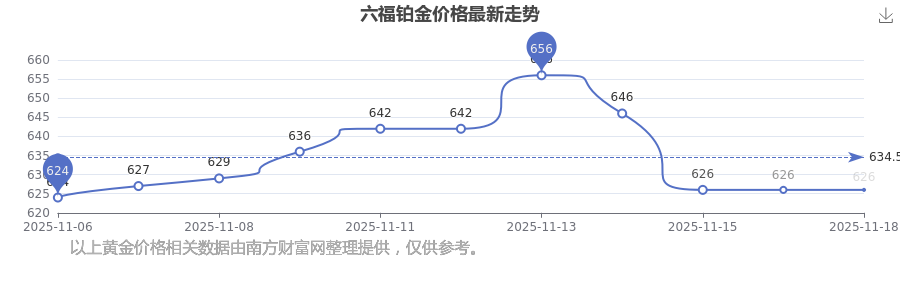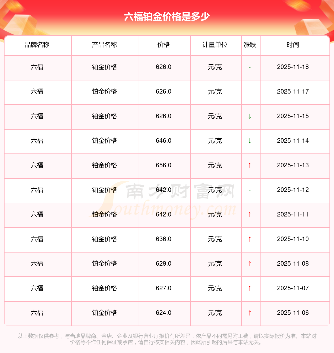 据了解,今日六福 铂金价格的最新价格为626.0元/克。