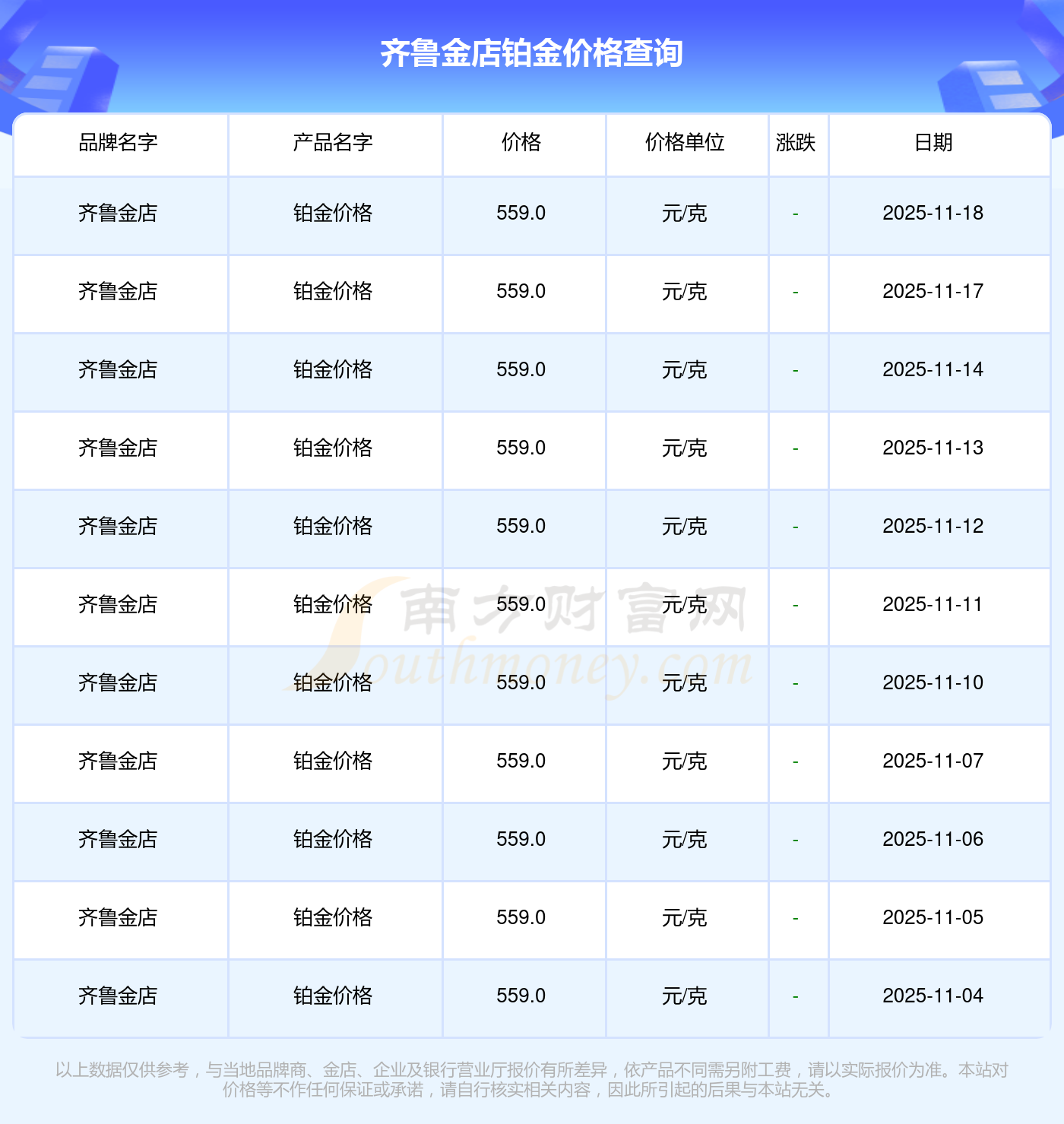 2025年11月18日齐鲁金店铂金价格为559.0元/克。