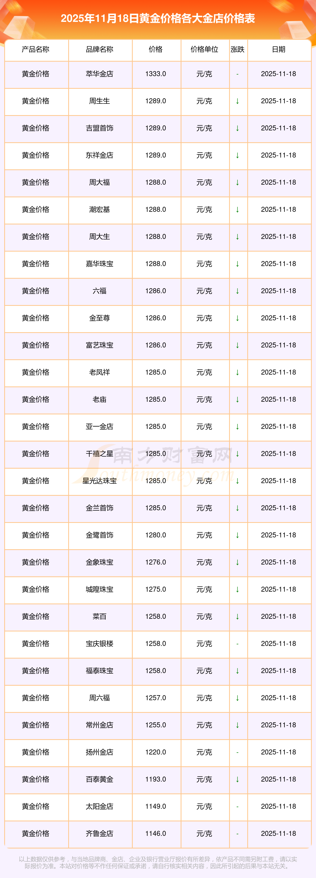 2025年11月18日,周大福、周大福、周大福、周大福、周大福、周大福、周大福、老凤祥、老凤祥、老凤祥、周六福等各大金店品牌黄金价格今日价格如下:周大福1288.0元/克、周大福626.0元/克、周大福1288.0元/克、周大福44770.0、周大福17820.0、周大福40390.0、周大福1127.0元/克、老凤祥1285.0元/克、老凤祥600.0元/克、老凤祥1285.0元/克、周六福1257.0元/克。
