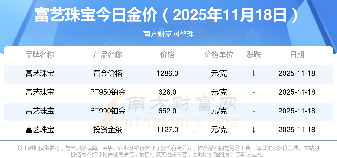 2025年11月18日富艺珠宝今日价格:黄金价格1288.0元/克,铂金价格626.0元/克,饰品金价(内地)1288.0元/克,黄金饰品(香港)44770.0,铂金价格(香港)17820.0,金条价格(香港)40390.0,金条金价(内地)1127.0元/克,黄金价格1285.0元/克,铂金价格600.0元/克,足金价格1285.0元/克,黄金价格1257.0元/克。