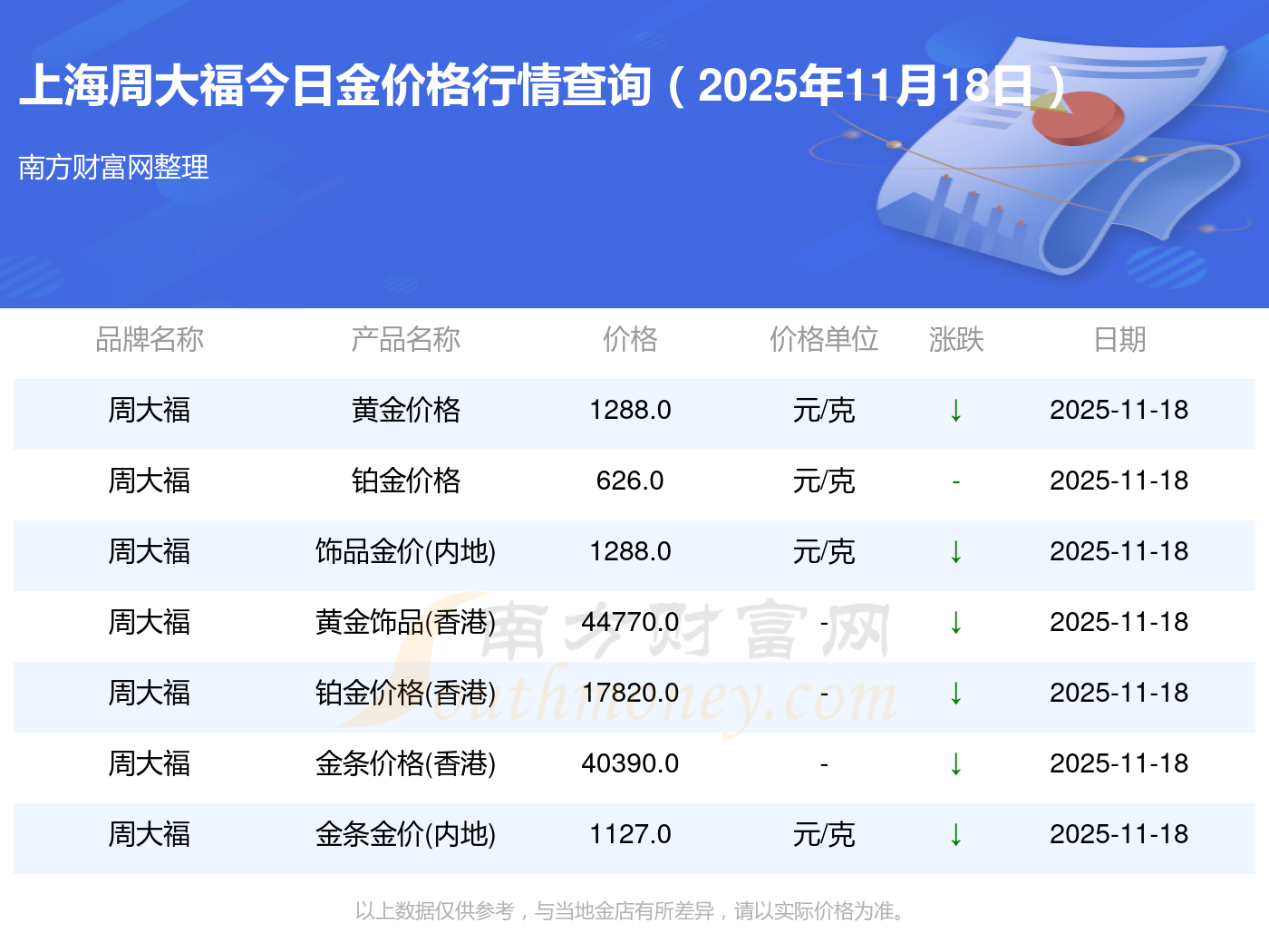 2025年11月18日上海周大福金价查询:黄金价格1288.0元/克,铂金价格626.0元/克,饰品金价(内地)1288.0元/克,黄金饰品(香港)44770.0,铂金价格(香港)17820.0,金条价格(香港)40390.0,金条金价(内地)1127.0元/克,黄金价格1285.0元/克,铂金价格600.0元/克,足金价格1285.0元/克,黄金价格1257.0元/克。